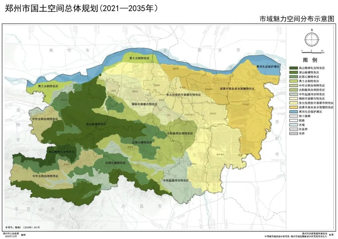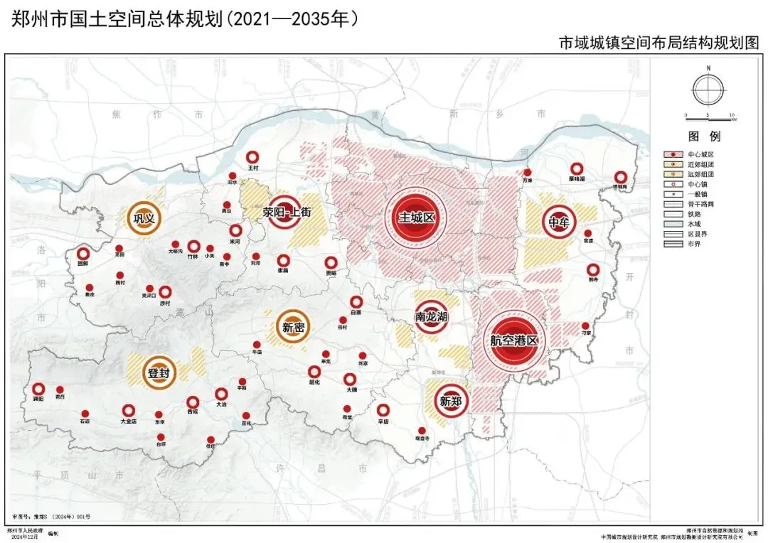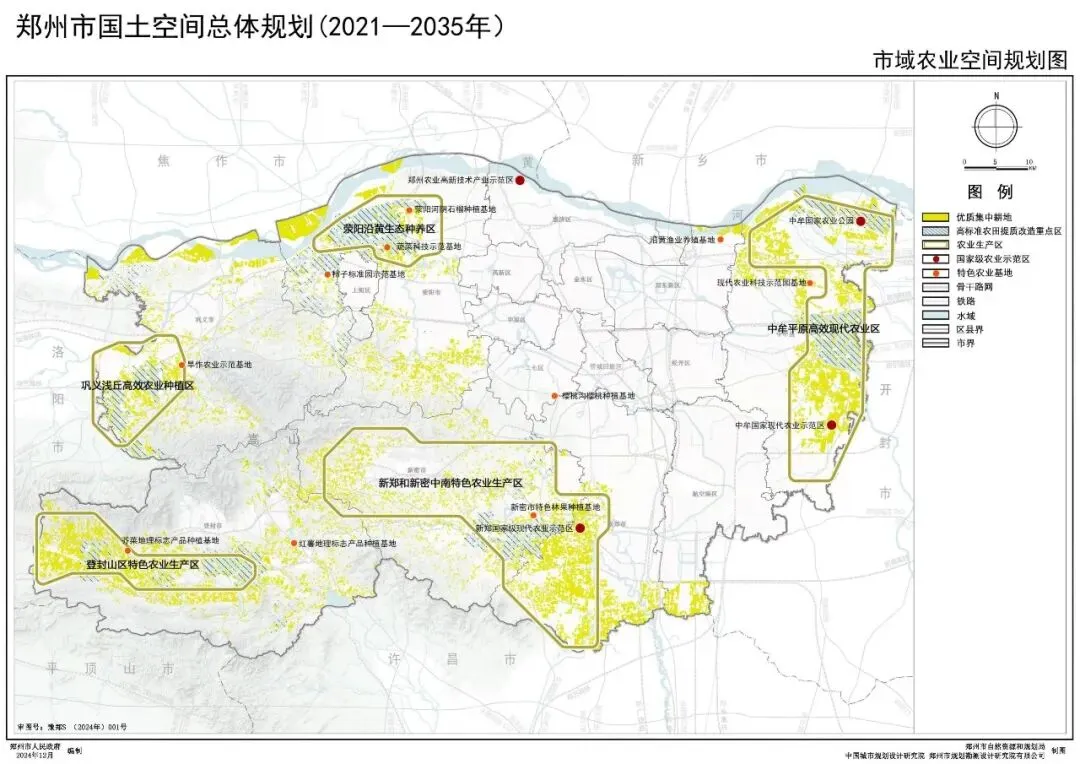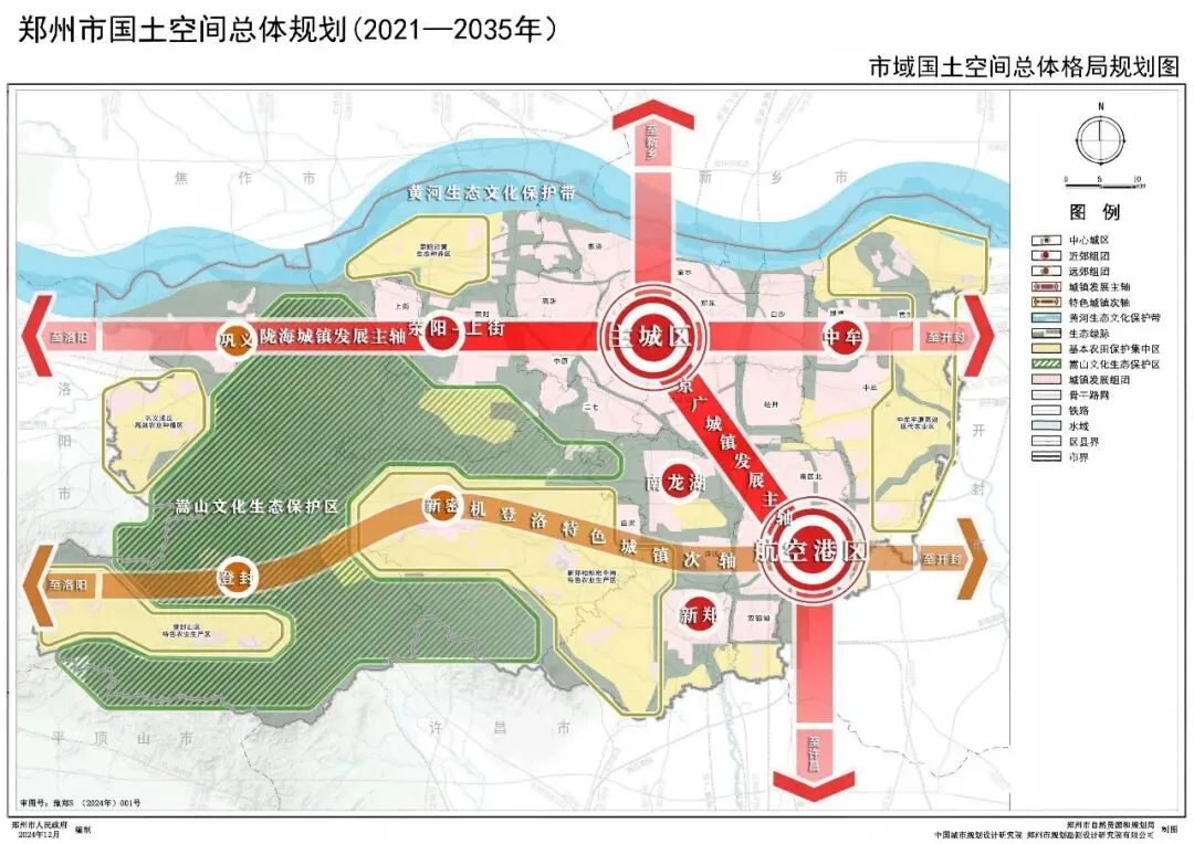 构建以“五片融合、一带一区、双核三轴”为引领,山、河、城、田和谐共生的市域国土空间总体格局。“五片融合”:以区域特色农业示范区、特色农产品标准化生产基地为核心,构建中牟平原高效现代农业区、新郑和新密中南特色农业生产区、荥阳沿黄生态种养区、巩义浅丘高效农业种植区、登封山区特色农业生产区“五片融合”的农业空间格局,拓展农产品多样化生产空间,稳步提高粮食产能、农业效益和竞争力。“一带一区”:保护由黄河文化生态保护带、嵩山生态文化保护区组成的“一带一区”生态基底。提升滨水生态空间,严控生态走廊,推进生态空间连接成网。保护生态绿心,形成高品质生态空间格局。“双核三轴”:以主城区和航空港区为“双核”,共同构建承载核心战略功能的区域性中心。以区域交通廊道为支撑,构建陇海城镇发展主轴、京广城镇发展主轴、机登洛特色城镇次轴“三轴”引领的城镇空间格局。陇海城镇发展主轴由主城区、中牟组团、荥阳-上街组团、巩义组团及沿线城镇构成,发展现代服务业和先进制造业等产业功能,提升区域城镇整体发展水平。京广城镇发展主轴由主城区、航空港区、南龙湖组团、新郑组团及沿线城镇构成,重点推动主城区与航空港区联动,发展先进制造业等产业功能,强化区域性经济要素集聚。机登洛特色城镇次轴由航空港区、新郑组团、新密组团、登封组团以及沿线城镇构成,重点加强城镇交通联系,发展文化传承、旅游观光、生态体验等产业功能。