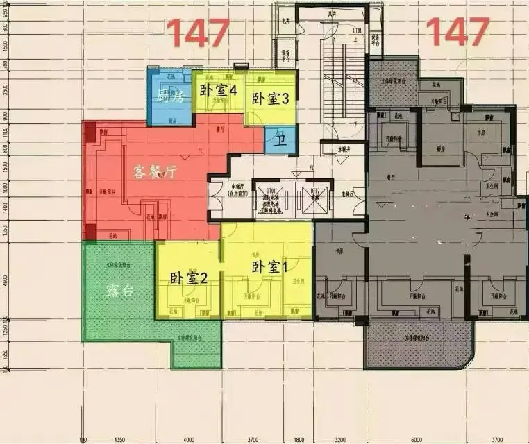 这部分是重点,也是豫园二期最能打的地方!主力面积段:约147㎡、175㎡、205㎡、235㎡,全是四代宅大平层,没有小户型,纯纯改善圈层!1️⃣ 建面约147㎡ 四房三卫(主力户型,占比37.5%,约180套)
