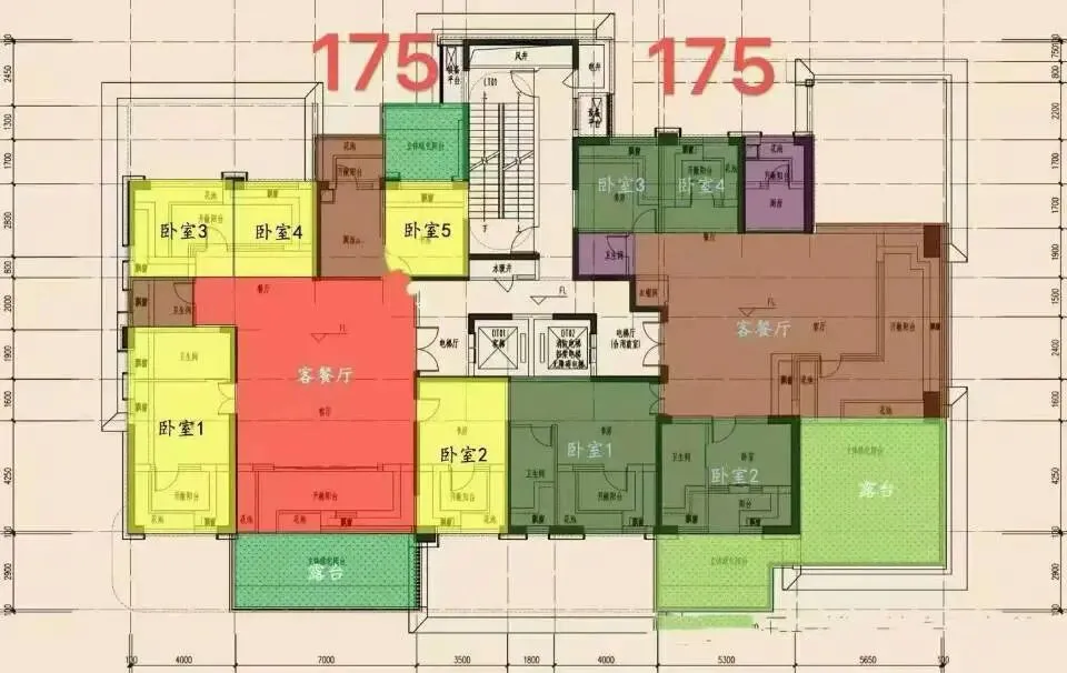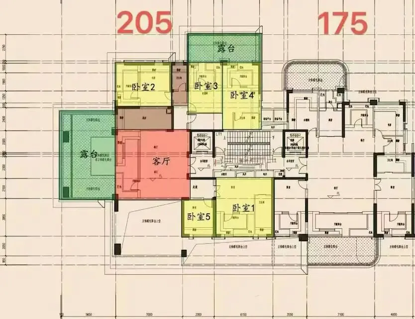 👉 梯户:两梯两户,独立电梯厅(全赠送),私密性拉满👉 得房率(含赠送):约140%,实得约208㎡!格局:4房2厅3卫 + 南北双空中庭院,双套卧设计(主卧+长辈房都有独立卫生间),多代同住不打扰面宽:约13.7m南向四开间,全明通透,没有暗间,采光巨好庭院:南庭院约6.5m×2.4m、北庭院约3.5m×2.4m,都能封闭,相当于多两个房间,拓展性拉满细节:客厅约4.8m面宽,连通南庭院;主卧带独立衣帽间、双台盆卫生间+飘窗,舒适度在线总结:纯改善起步,适合想一步到位、多代同住的家人,性价比拉满!2️⃣ 建面约175㎡ 五房三卫(边户/中户,占比25%,约120套)