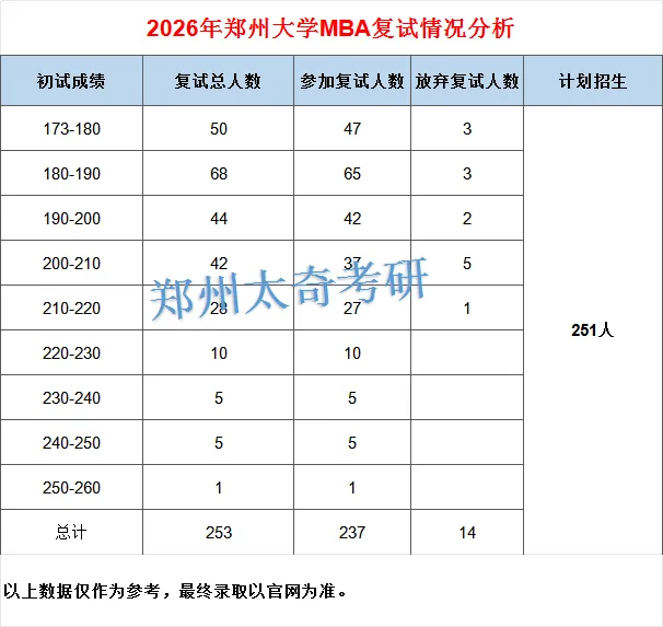 2026 年郑大非全 MBA 计划招生 251 人,进入复试 253 人,复试比例接近计划招生人数。有 14 名考生放弃复试,整体来看,达到院校分数线并认真准备复试,录取机会相对可观。