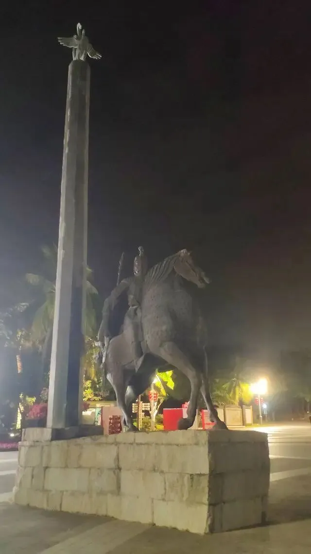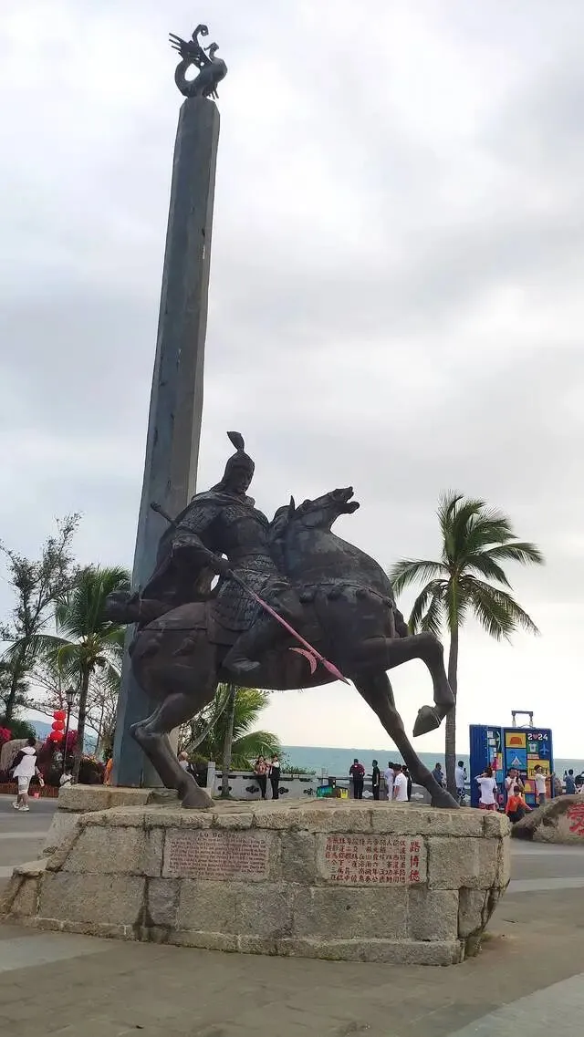 景区广场左右两侧,雄立两座伏波将军塑像。伏波意为降伏波涛,伏波将军封号是古代对将军个人能力的肯定。一位是为西汉“定南越、开九郡”的伏波将军路博德,另一位是东汉南征北战东征西讨马革裹尸的伏波将军马援。两位将军塑像跨马执兵,威风凛凛,栩栩如生。他们都曾为国开疆拓土,功勋卓著,平定南疆,威震岭南,被后世海南人民奉为神祗。