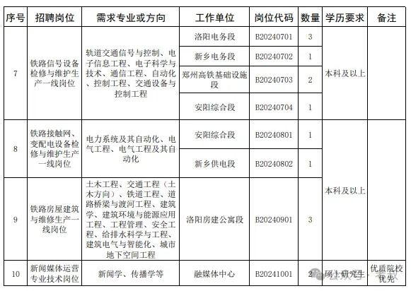 4.专业对口,成绩优良,符合招聘岗位要求的学历、专业等条件。铁路专业方向(包含铁路专业课程)的高校毕业生、优质高校毕业生优先。