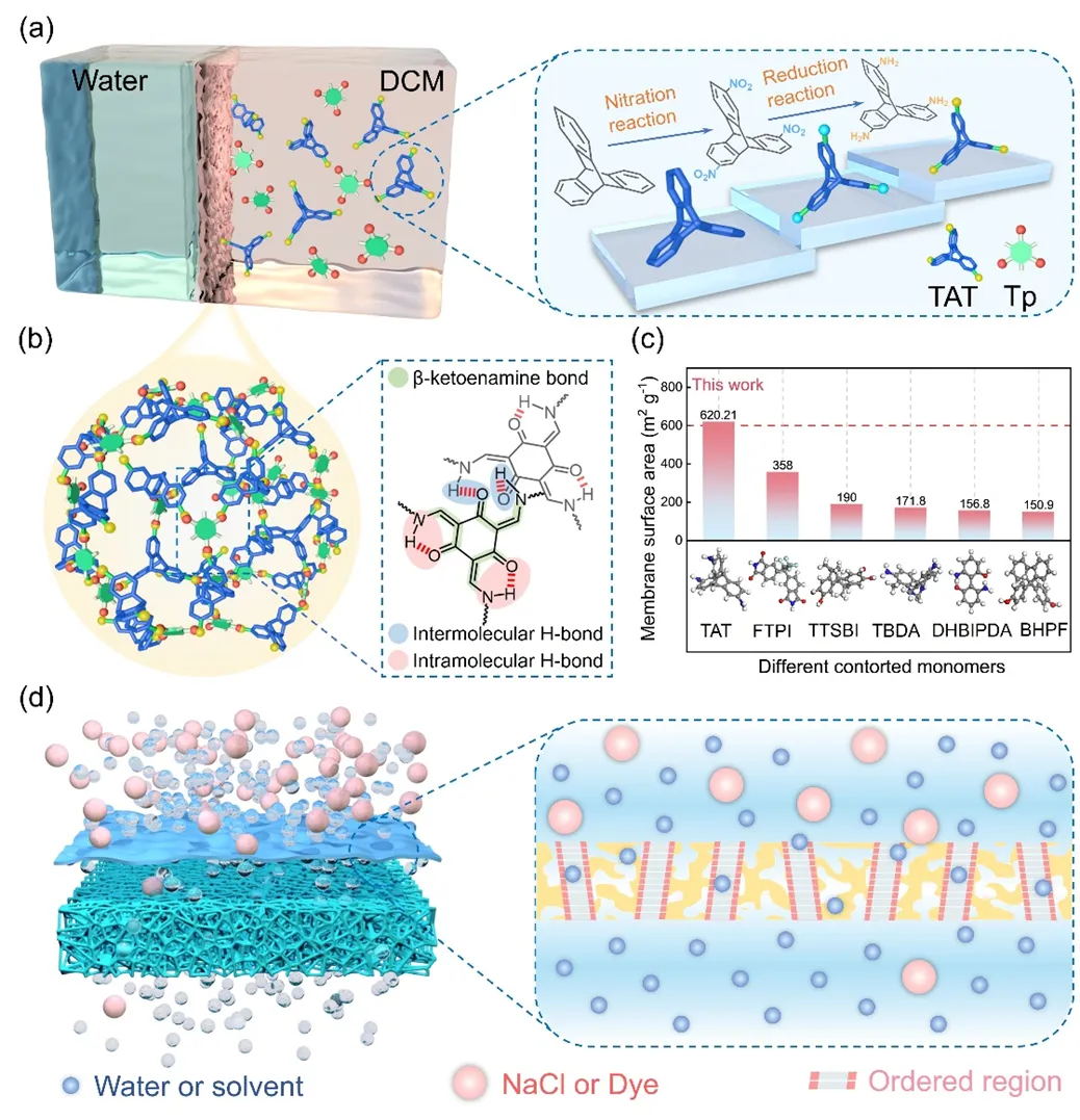 该研究提出一种分子连接工程策略,通过界面限域生长方法,以三维刚性扭曲单体 2,6,14 - 三氨基三蝶烯(TAT)和含三羟基的三醛单体 1,3,5 - 三甲酰基均苯三酚(Tp)为构建块,成功制备出聚 β- 酮烯胺基微孔复合膜。