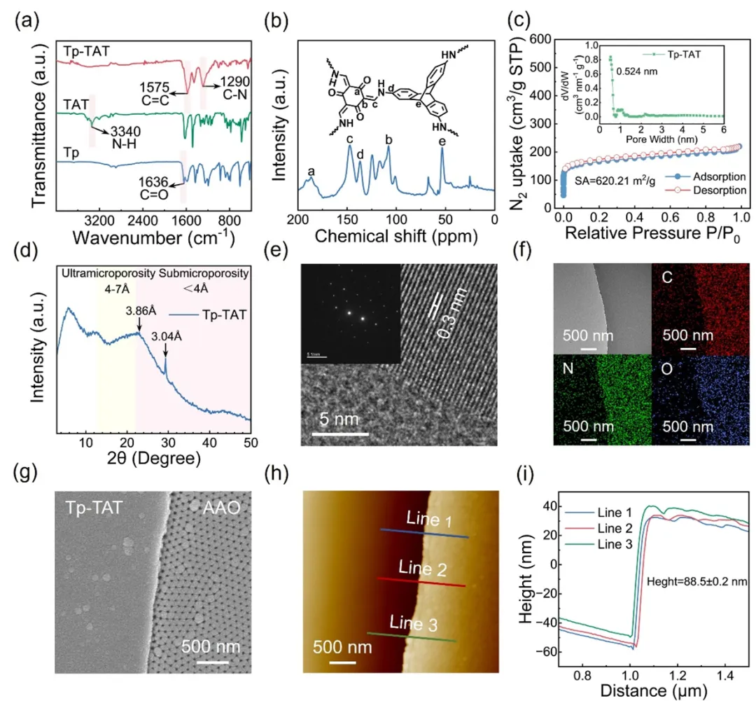 图2 界面限域生长制备Tp1-TAT1-12自支撑膜的形态与表征。(a) Tp1-TAT1-12膜的ATR-FTIR谱和(b) Tp1-TAT1-12膜的固态13C NMR谱。(c) Tp1-TAT1-12膜在77K下的N2吸附等温线,插图表示采用非局部密度泛函理论(NLDFT)建模的孔径分布。(d) Tp1-TAT1-12膜的XRD图谱。(e) Tp1-TAT1-12膜的HR-TEM图像和SAED图(插图)。(f) Tp1-TAT1-12膜的TEM图像和元素映射图。(g)多孔阳极氧化铝(AAO)衬底上Tp1-TAT1-12膜的俯视SEM图。(h) Tp1-TAT1-12膜的AFM图像和(i)高度分布图。