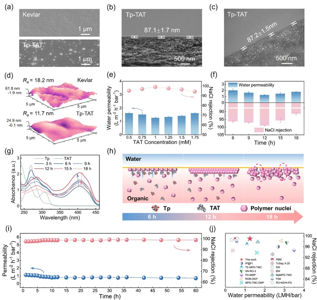 图3 Tp1-TAT1-12复合膜的形态、表征及反渗透脱盐性能。(a) Tp1-TAT1-12复合膜和Kevkar基底的SEM图。Tp1-TAT1-12膜的(b)横截面SEM图像和(c) TEM图像。(d) Tp1-TAT1-12复合膜和Kevlar膜的AFM图像。(e) 不同TAT浓度下Tp1-TATy-12膜的脱盐性能(Tp浓度保持在1 mM,反应时间为12 h)。(f) 不同反应时间下Tp1-TAT1-z膜的透水性和NaCl截留性能。(g) 低聚物在DCM中随反应进展的紫外-可见吸收光谱 (反应时间为0 ~ 18 h)。(h) 分子链工程方法成膜示意图。(i) Tp1-TAT1-12膜的长期运行稳定性。(j) Tp1-TAT1-12膜的脱盐性能与最近报道的反渗透膜的比较。L m−2 h−1 bar−1表示升/平方米/小时/ bar。进料为2 g L-1 NaCl溶液,操作压力为15 bar。