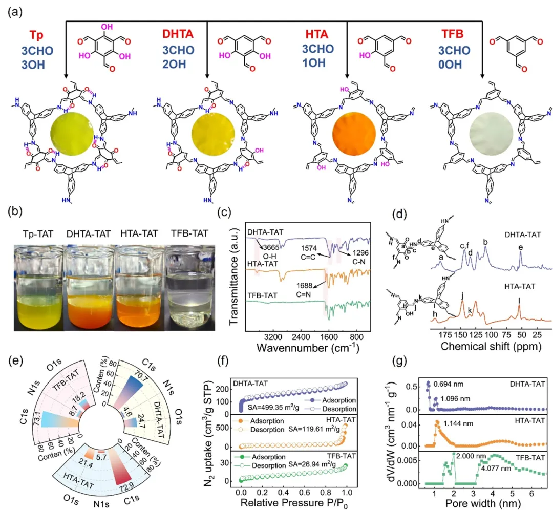 图4 (a) TAT与不同醛单体反应形成的化学结构。(b) 将去离子水分别加入不同的低聚物前体DCM溶液中12 h后纳米膜形成的图像。(c) 不同膜的ATR-FTIR光谱,(d) 固态13C NMR光谱,(e) XPS光谱。(f) 不同膜在77K下的N2吸附等温线。(g) 采用NLDFT模型计算DHTA-TAT膜和HTA-TAT膜的孔径分布。采用BJH法计算TFB-TAT膜的孔径分布。TAT浓度为1 mM,所有醛单体浓度均为1 mM,反应时间为12 h。