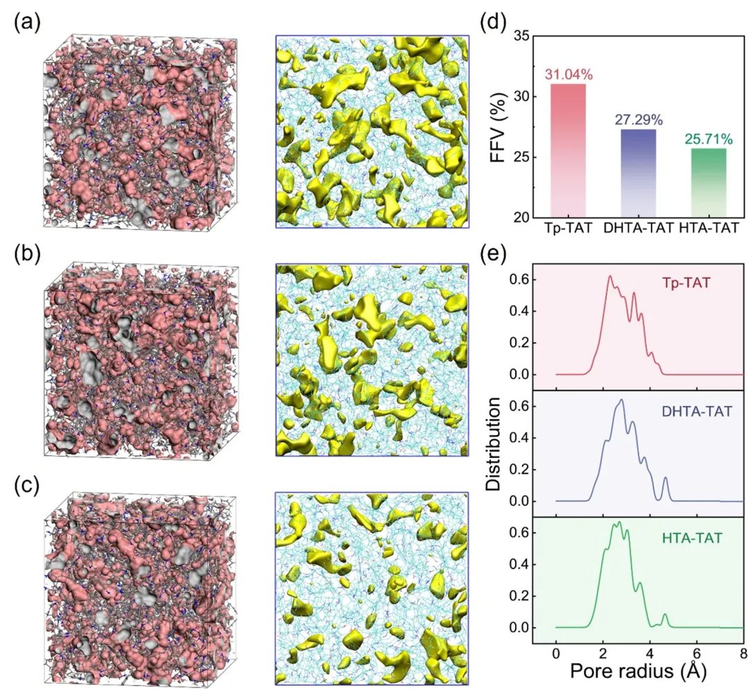 图5 TAT-M网络模型结构分析。(a-c) 对TAT-M网络的能量最小化的三维非晶单元胞进行了模拟。所得到的模型将检测到的空洞以粉红色显示,其相应的孔径以灰色显示,探针半径为0.6 Å。(d) TAT-M膜系统的模拟分数自由体积(FFV)。(e)模拟TAT-M网络系统的孔径分布。