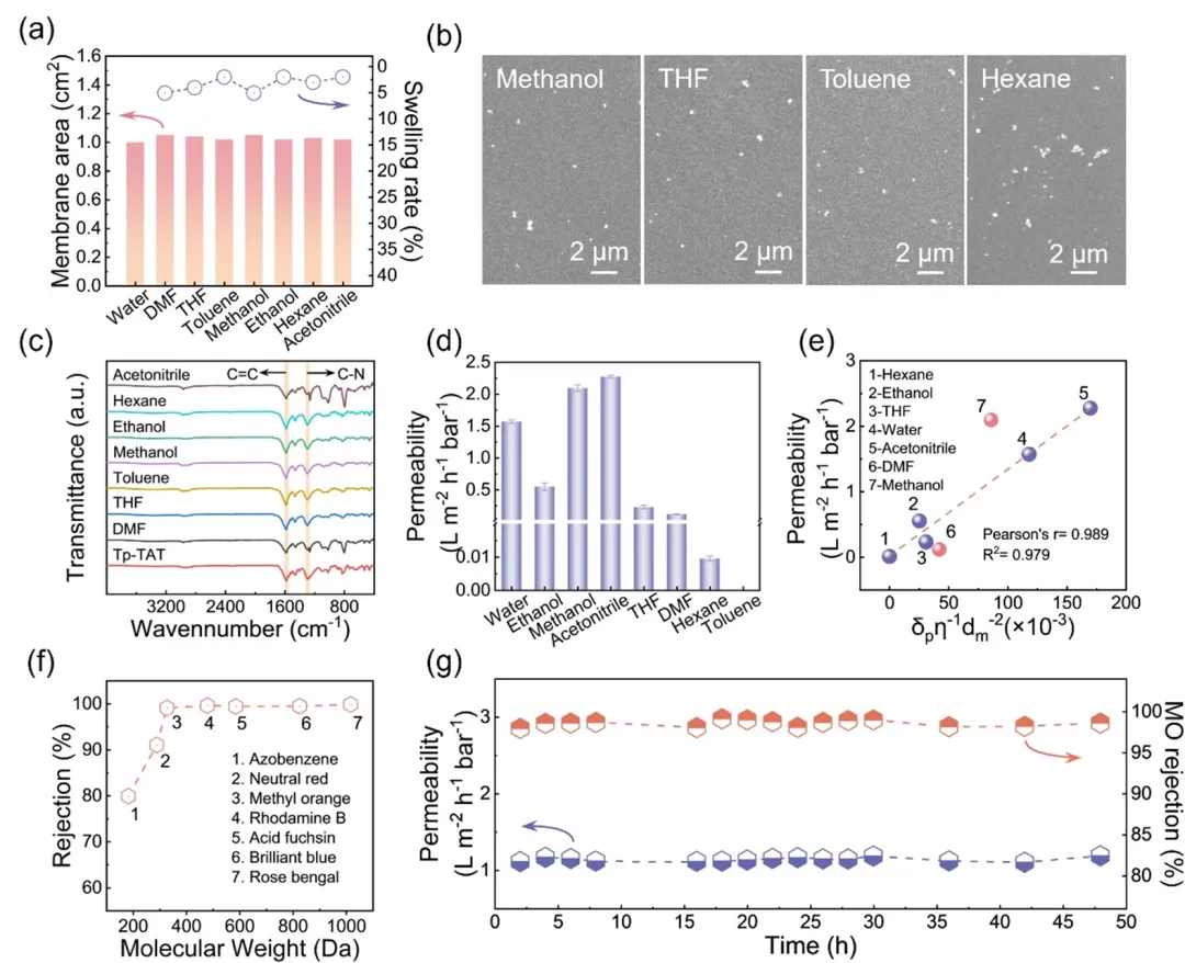 图6 Tp1-TAT1-6膜的耐有机溶剂性。(a) Tp1-TAT1-6膜在不同有机溶剂中浸泡30天后的溶胀率,(b) SEM图像,(c) ATR-FTIR光谱。d) Tp1-TAT1-6膜对有机溶剂的渗透性不同。(e) 有机溶剂渗透性与其物理性质的关系。(f) Tp1-TAT1-6膜的有机染料甲醇溶液处理性能。(g) Tp1-TAT1-6膜对甲基橙甲醇溶液的长期稳定性试验。所有的测试都是在恒压10 bar的死端过滤装置下进行的。