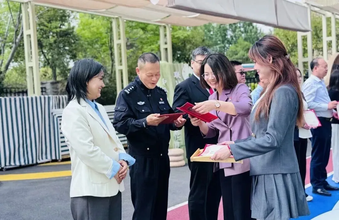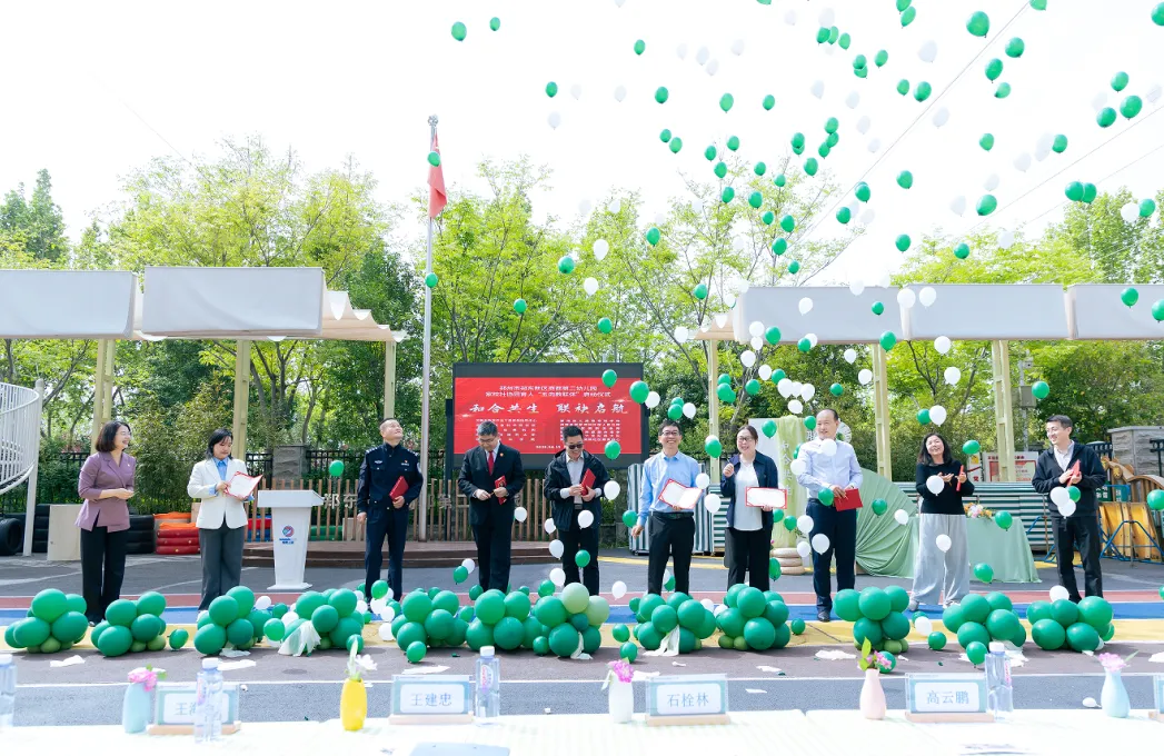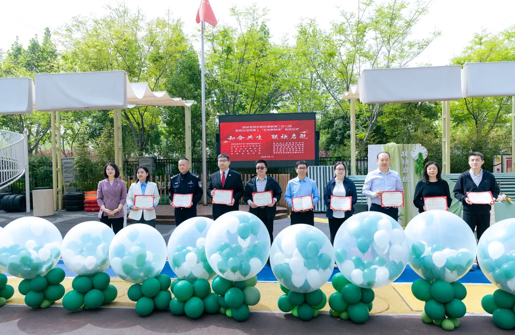 河南省教育厅关工委家教指导中心建设部主任王海勇、河南省气象科学研究所副所长、河南省首席科普专家王建忠、中新社驻豫机构工会主席马亚军、河南省中医药大学工会副主席王浩然、河南省科学院党政办副主席娄星敏、郑州幼儿高等专科学校学前教育学院副院长张莹、河南自贸区郑州片区人民法院政治部副主任高云鹏、郑东新区圃田派出所所长石栓林、郑东新区商都路办事处党工委委员翟羽佳、郑东新区六支队四大队队长卜隽峰、郑东新区莲湖路社区服务中心主任王永侠等十余家共建单位代表、幼儿家长代表、幼儿园行政人员及骨干教师共同见证这一具有里程碑意义的时刻。
