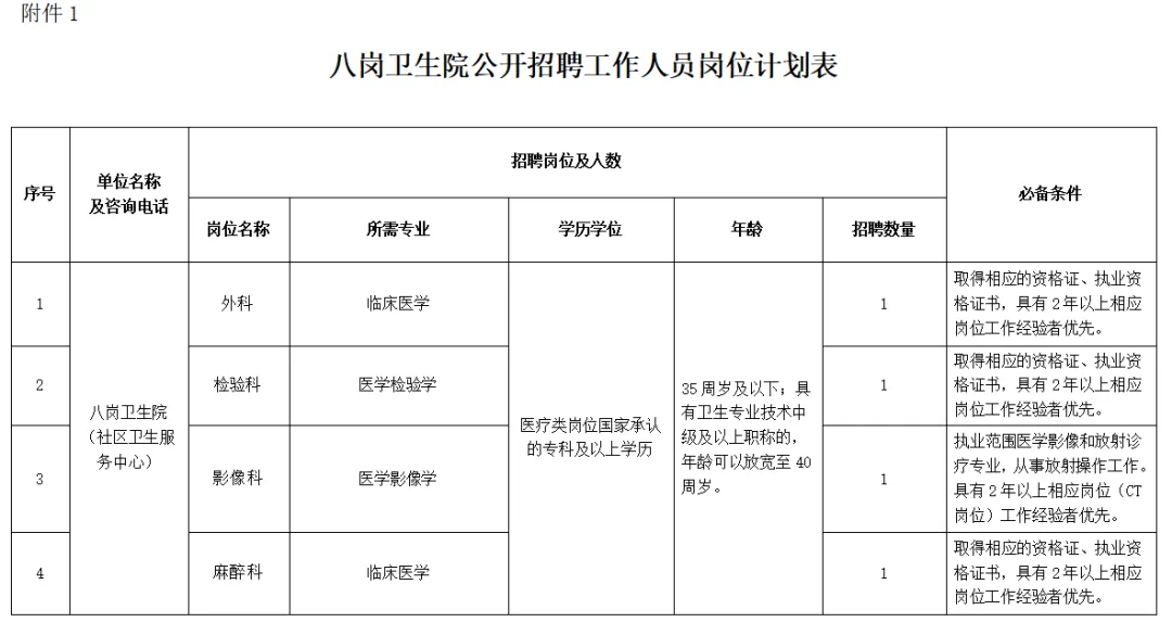 具体招聘岗位、任职要求、计划招聘人数等详细情况,详见《八岗卫生院公开招聘工作人员岗位计划表》(附件1)。
