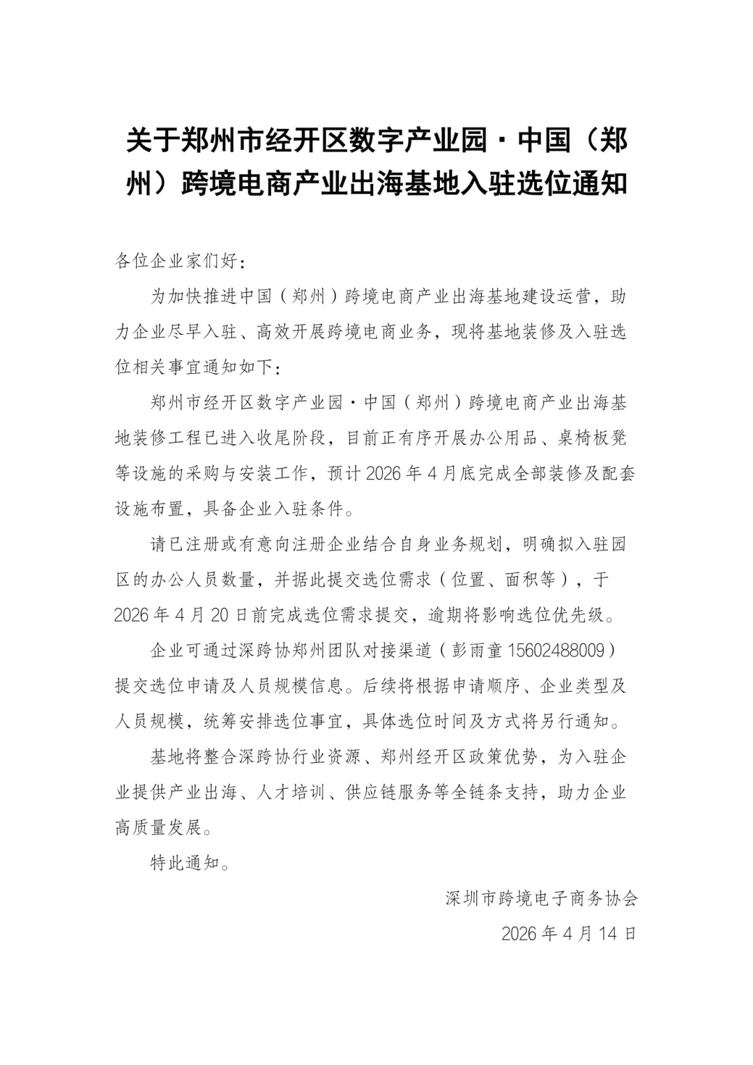 已注册或有意向入驻的企业,可结合自身业务规划,明确拟入驻园区的办公人员数量,同步确定选位需求,务必在2026年4月20日前完成选位需求提交,逾期将影响选位优先级,千万不要错过!基地入驻选位对接人:深跨协郑州团队 彭雨童15602488009