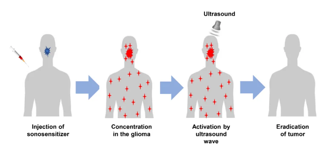 图1. 声动力疗法联合放化疗治疗流程示意图。患者先接受血卟啉注射,在药物于肿瘤部位富集后,通过经颅超声设备进行靶向照射,激活药物杀伤肿瘤,并与后续的放疗、化疗步骤协同。
