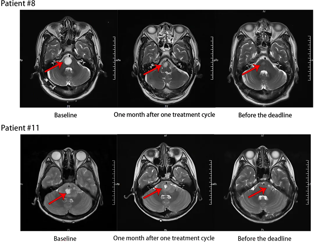 这项发表于《International Journal of Cancer》的研究,首次在全球探索了声动力疗法联合放疗用于脑干胶质瘤(含高级别)的安全性。核心结论:非常安全。所有11名患者治疗相关的不良反应均为1-2级(轻度至中度),未出现任何3级及以上严重不良反应或剂量限制性毒性。治疗耐受性良好。疗效信号:在可评估的患者中,72.7%的患者病情保持稳定,18.2%达到部分缓解(肿瘤缩小)。研究通过MRI影像直观地展现了肿瘤治疗后的变化。例如,患者#8和患者#11在基线期、治疗周期结束后1个月以及随访截止前的MRI对比显示,肿瘤得到了有效控制或缩小。