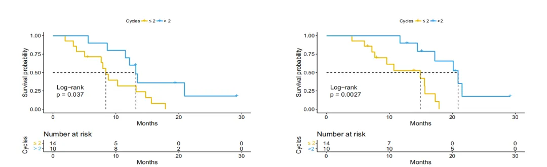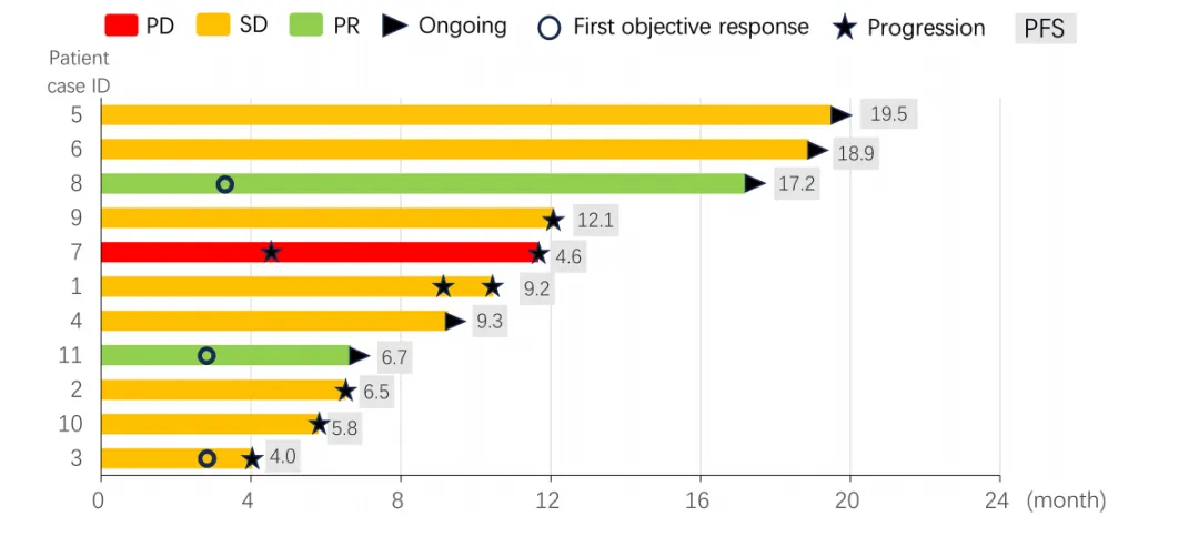 图3. 上图展示了两位患者治疗前后MRI的对比变化。患者的中位无进展生存期(PFS)达到 9.2个月,中位总生存期(OS)为 11.7个月,为后续研究奠定了坚实的基础。