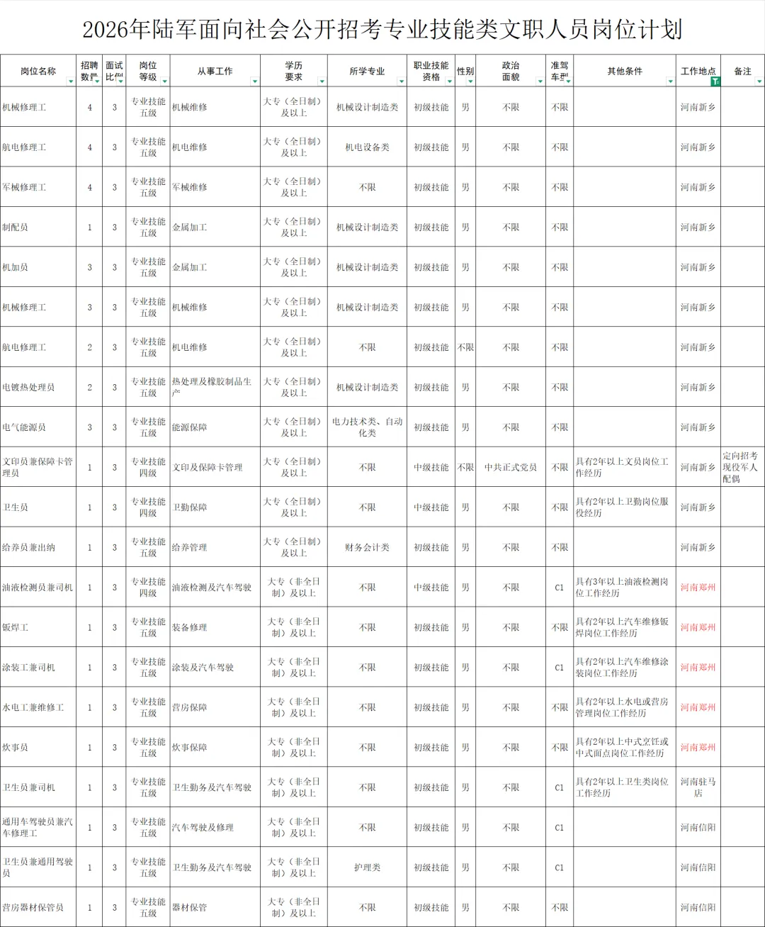 陆军专业技能类文职人员的招聘