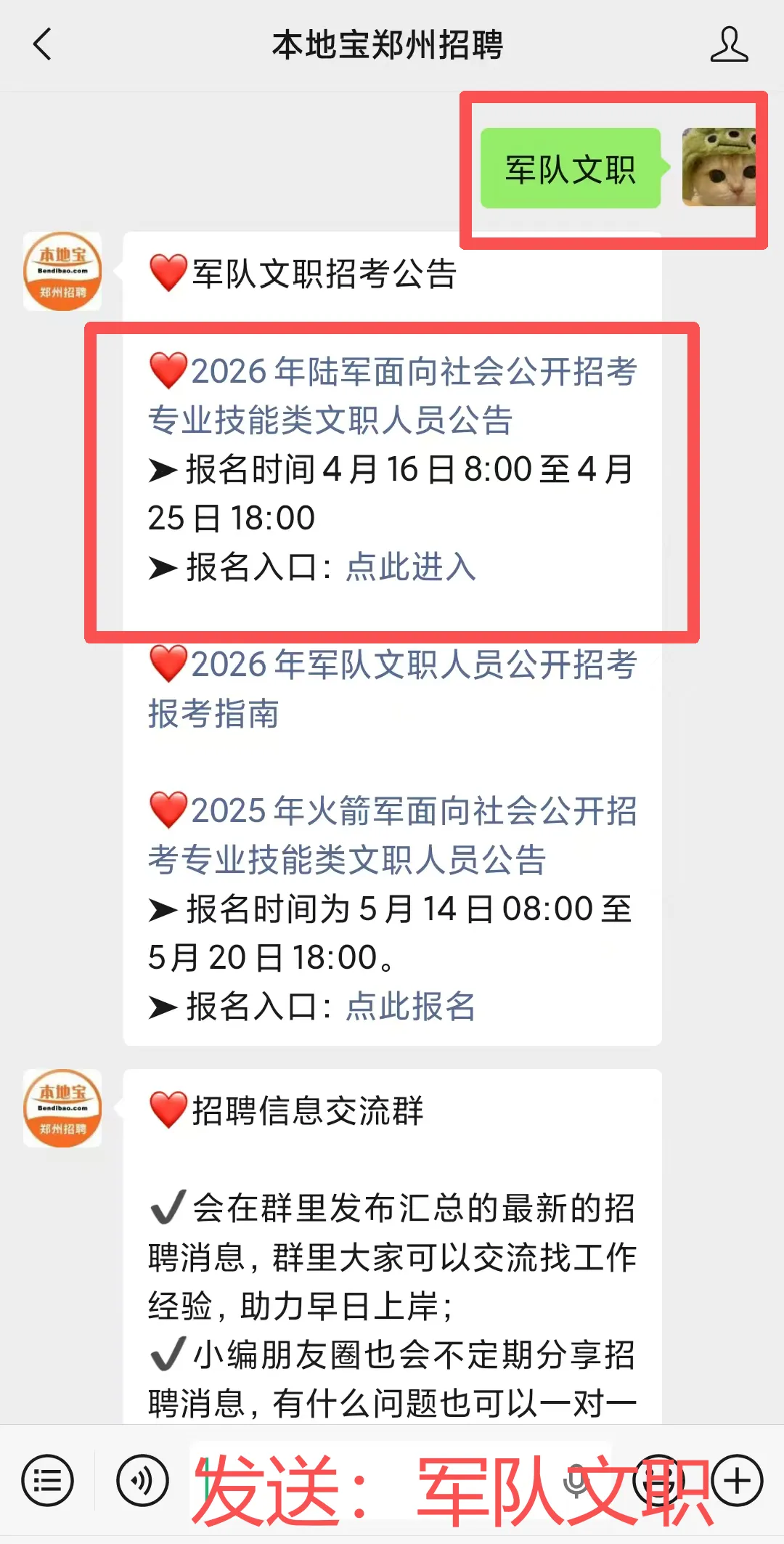 温馨提醒:可扫描下方二维码关注【本地宝郑州招聘】微信公众号并在对话框回复【军队】即可获取详细公告、报名入口等