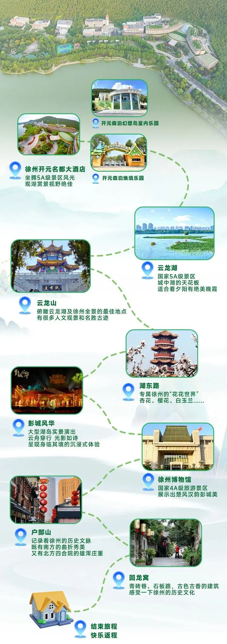 晚上如果有时间,一定要来看一场据说是中国首部大型湖岛实景演出——《彭城风华》。在光影营造的“楼、林、亭、桥、塔”的东方美学幻境中,登船赴一场与苏轼的千年之约。可以提前网上购票,现场扫码换纸质门票,同时也是船票。回龙窝曾是徐州古城的南大门,古城墙段距今已有600多年历史。City walk一圈下来,一竖两横,三条不足400米的居民小巷,不算太大。但雅致的院落和小店有很多,品茶、喝咖啡、文创品,闹钟取静的雅致说来就来。就连误入了一家种子商店,随便拿起哪一个,都能契合轻快的心情。顺着青砖铺的路面,漫步在狭窄的小巷,墙外是流年斑驳,墙内是岁月静好。喝个饣它(shá)汤,吃个烧烤,啃个油烫鸭,嘬个蒜爆鱼,再点几道本地菜,可以让你更快地了解这座城市。还有被我们摄影师小姐姐一直按头安利的菜煎饼,主打一个自助且量大,十几种菜品可供选择。上下煎饼铺开压实,烙熟后,切成4块,那味道,别提了~住在云龙湖旁边当然要来一杯云龙让茶喽,附赠的小书签也算是旅行中的一点小纪念吧。总之在徐州逛吃了两天,没有任何雷点,只有6个字。好吃!爱吃!推荐!好了,徐州的逛吃攻略一并送上了,赶紧下单预约房间吧~👇【玩】森泊焕境乐园室外萌宠无动力乐园+幻想岛室内乐园【住】开元房(大床/双床)1间入住2晚【食】2份自助早餐(身高1.3米以下儿童免费)【玩】森泊焕境乐园室外萌宠无动力乐园+幻想岛室内乐园【住】高级房(大床/双床)1间入住2晚【食】自助早餐2份(1.3米以下儿童免费)【玩】森泊焕境乐园室外萌宠无动力乐园+幻想岛室内乐园备注: