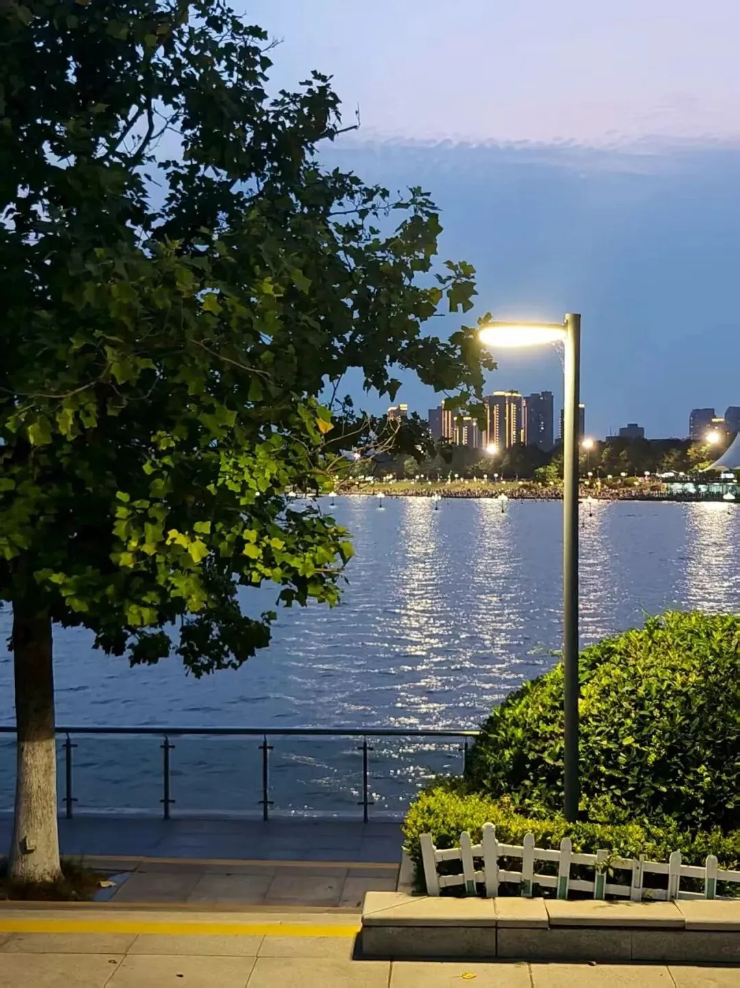 暖黄的光与蓝色的天色相互映衬,湖面仿佛被披上了一层梦幻的薄纱。