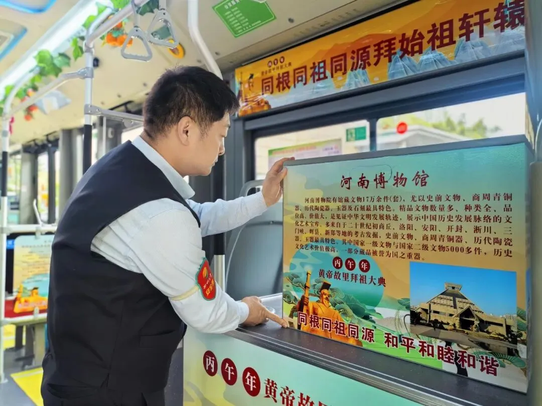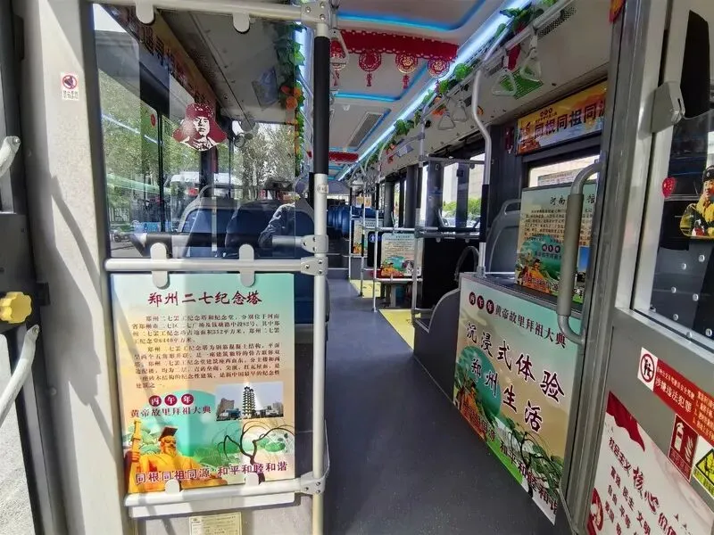走进车厢,浓厚的文化氛围扑面而来,车厢内不仅详细介绍了拜祖大典的演变脉络,清晰呈现“三月三,拜轩辕”的千年传承,还张贴了河南博物院、黄河风景名胜区、二七纪念塔等文旅地标及河南烩面、胡辣汤等特色美食,让乘客乘车途中,全方位解锁郑州“沉浸式生活体验”。同时,还张贴“云拜祖”二维码,乘客扫码即可参与拜祖大典,真正实现“上车即入景,扫码即拜祖”的沉浸式体验。不少乘客称赞,这种“移动的文旅展厅+线上拜祖”的创新形式,既新颖又实用,为出行增添了文化趣味与情感温度。