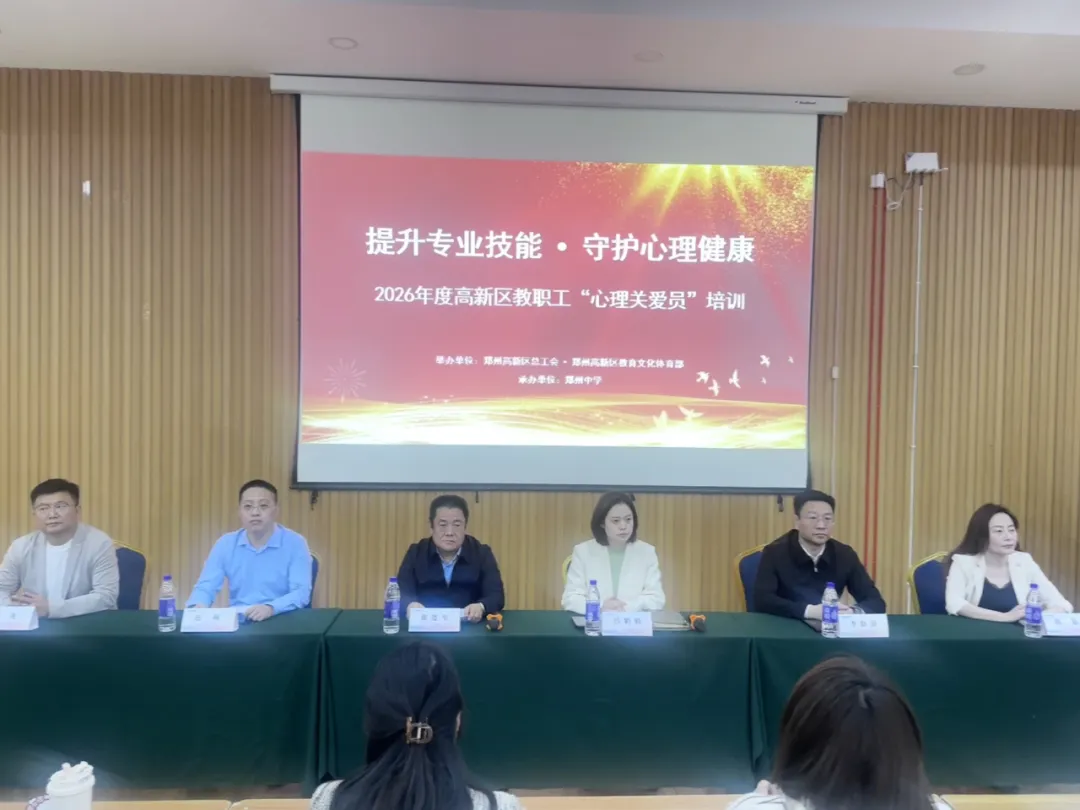 4 月 16 日,郑州高新区中小学心理关爱员培训开班仪式暨首次课程在郑州中学体育馆举行。郑州高新区总工会主席谢连生,高新区教育文化体育部党委委员、副部长吕娟娟出席并致辞。