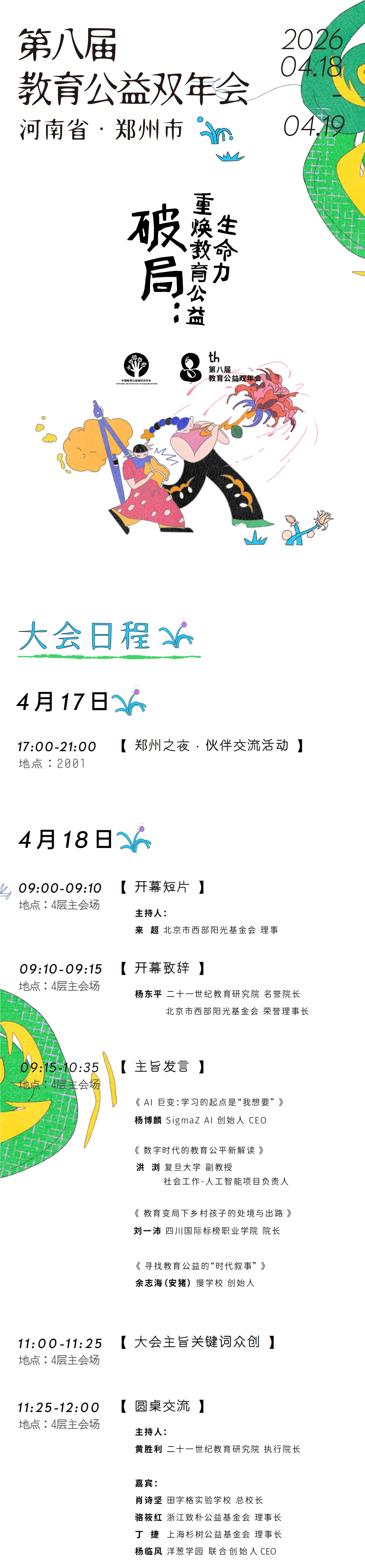 2026年4月18日至19日,第八届教育公益双年会即将在郑州和大家见面啦!今年大会以“破局:重焕教育公益生命力”为主题,诚邀每一位关心教育公益的你,一起来聊聊困惑、碰碰灵感、找找新思路。