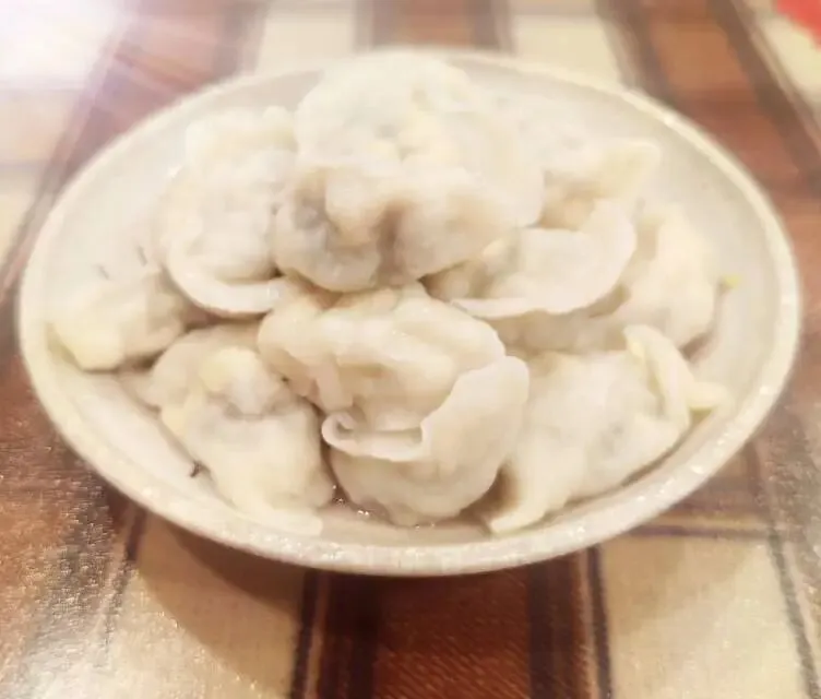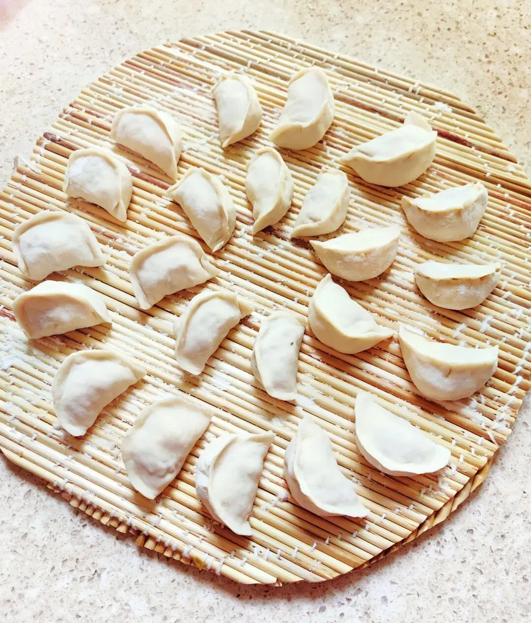 包饺子的面是头天晚上就和好的。面要软硬适中,放保鲜袋,在冰箱里醒一夜。这样的面,第二天摸上去糯糯的,还很有韧性,擀出的饺子皮薄薄的。馅料填进去,左手托皮,右手捏褶,一个饺子就成了。看着他们一个一个在竹帘上转圈圈,圆鼓鼓、胖乎乎的,活像一只只小白鹅。