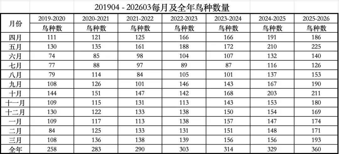 这个观察年除了2025年4月比去年同期少了5种,其它月份是节节攀升,超过20几种已经觉得是很大的突破了,没想到上个月,也就是2026年3月份的鸟种比去年同期竟然高出37种。