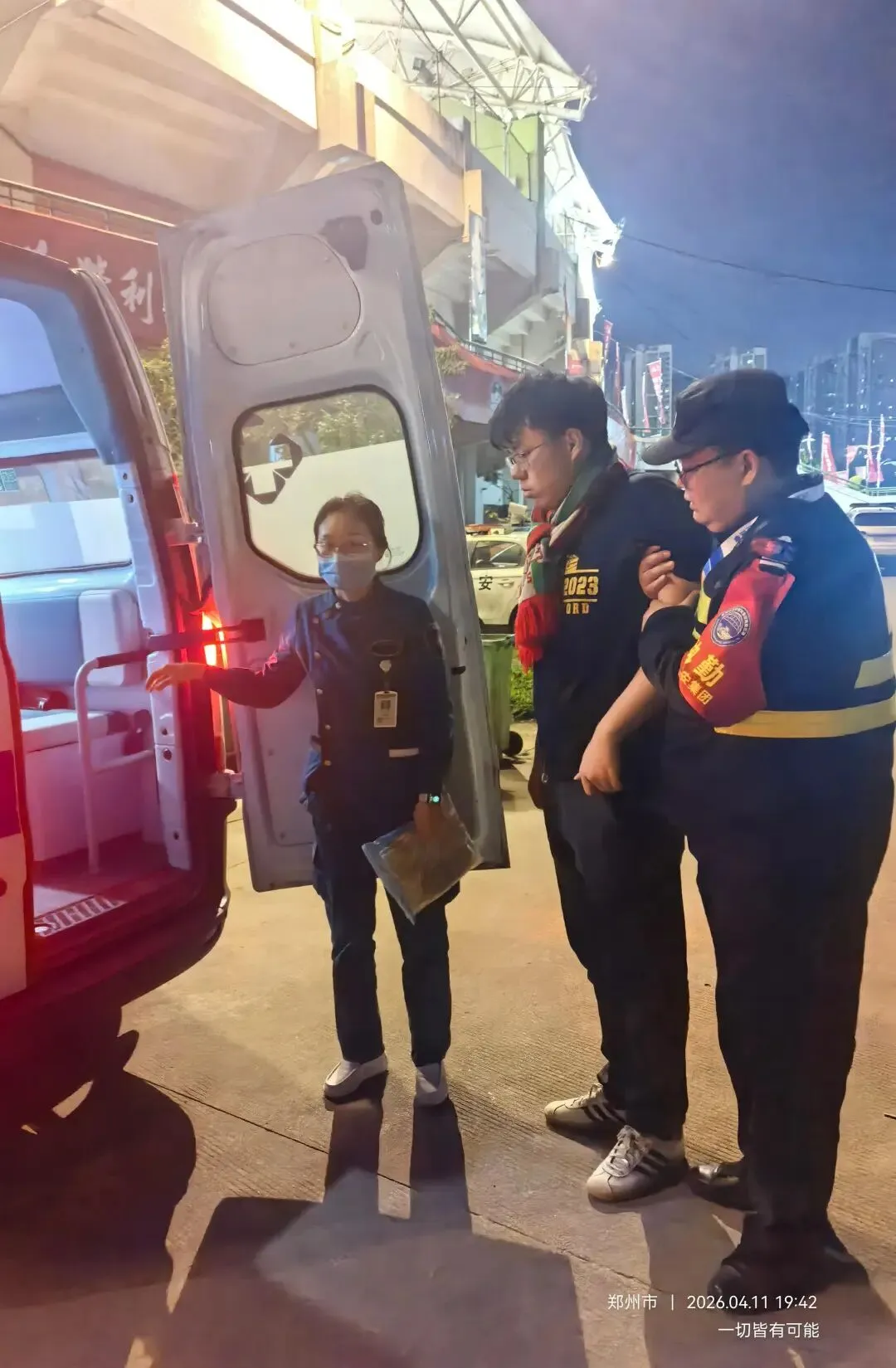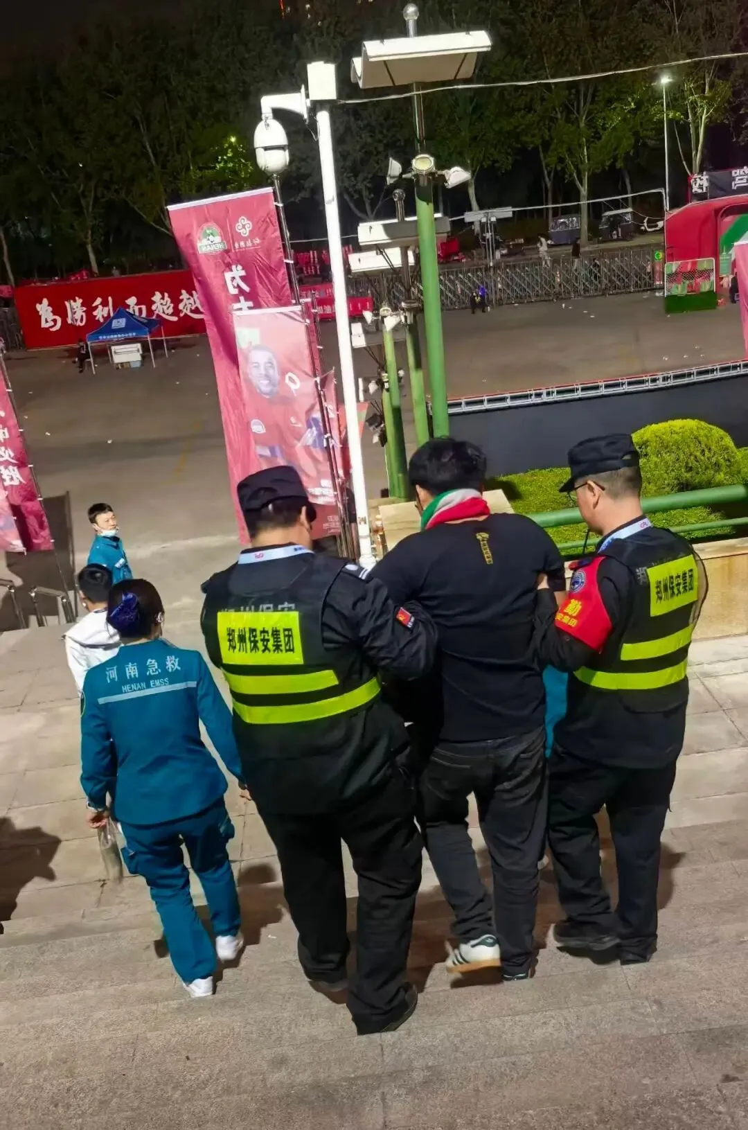 比赛进行中,意外发生了:一名球迷在上台阶时不慎摔倒,当即捂着腰部,剧痛难忍,动弹不得。正在附近的值班队员第一时间冲了过去,小心翼翼地将伤者搀扶到旁边的石墩上坐下。与此同时,二七副经理周建峰迅速通过对讲机向现场指挥部报告情况。