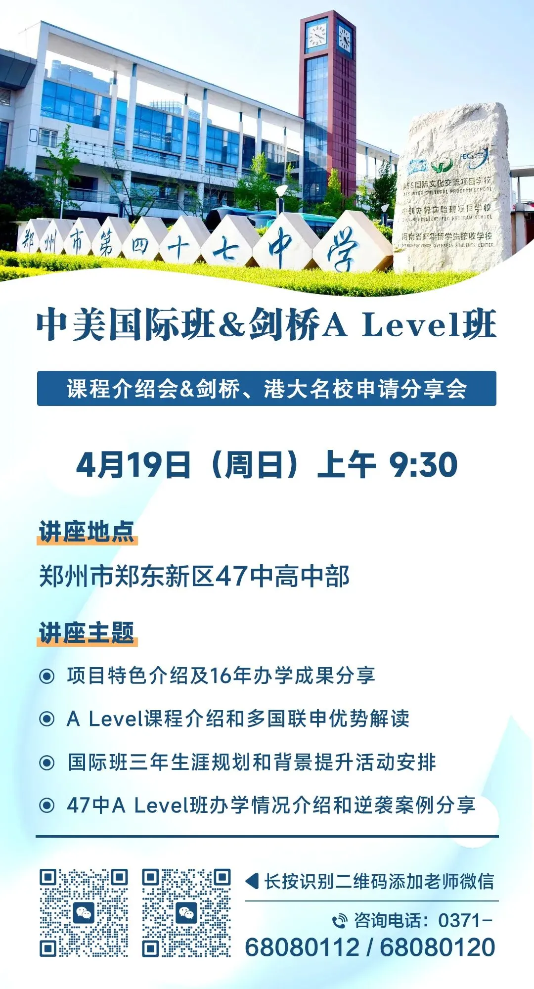 郑州市第四十七高级中学中美项目设有“中美国际班”和“剑桥A Level班”两种班型,引进“美高+AP”和“A LEVEL”两大主流国际课程体系,开设托福、雅思及SAT等标化考试课程,为不同留学方向需求的学生提供了丰富多样的选择。