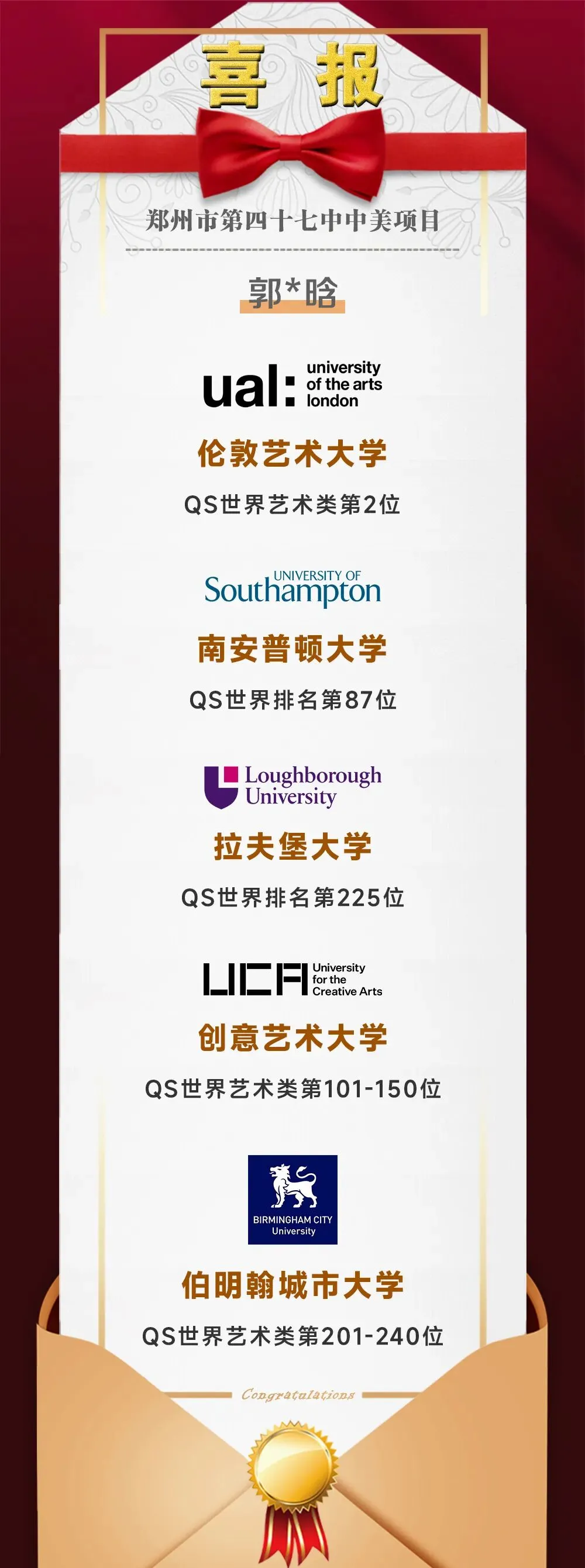 郭*晗同学一举斩获 伦敦艺术大学、南安普顿大学、拉夫堡大学、伯明翰城市大学、创意艺术大学 等顶尖艺术院校录取;