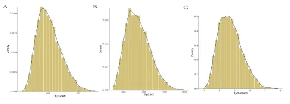 本研究共纳入 8677 名参与者,其中男性 4031 人、女性 4646 人,中位年龄 58.0 岁(四分位距 52.00, 65.00)。TyG-BMI、TyG-WC、TyG-WHtR 均呈正态分布,均值 ± 标准差分别为 204.44±38.87、743.20±117.30、4.72±0.76。