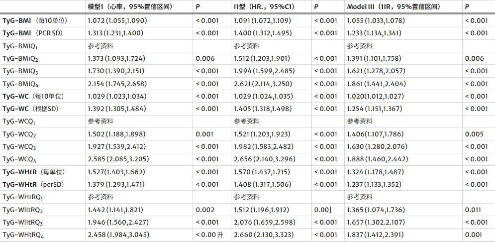 为探究 TyG-BMI、TyG-WC 与 TyG-WHtR 三项修正 TyG 指数和中风风险的关联,构建了 3 种 Cox 比例风险回归模型。