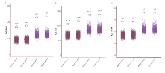 基于 2011 和 2015 年的随访数据,采用 K 均值聚类及欧氏距离将参与者分为两类:1 类三项指数持续处于低水平,2 类则长期维持高水平,两类在不同时间点的 TyG‑BMI、TyG‑WC、TyG‑WHtR 数值均存在明显差异。