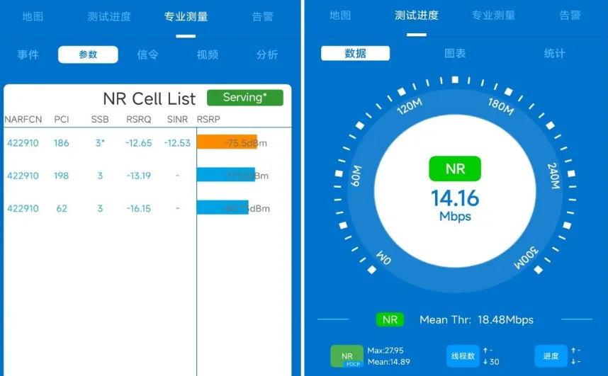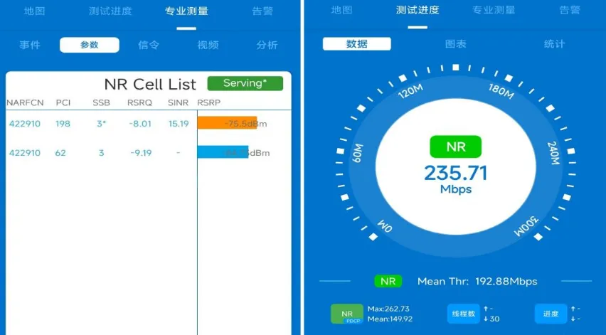 使用专业 5G 测试软件在用户投诉点位进行测试,重点采集所占用小区参数、信号质量与速率数据,测试界面核心参数如下:
