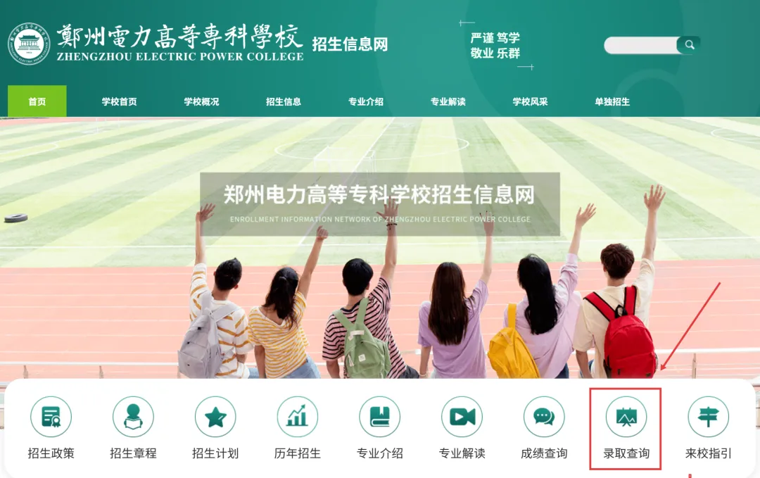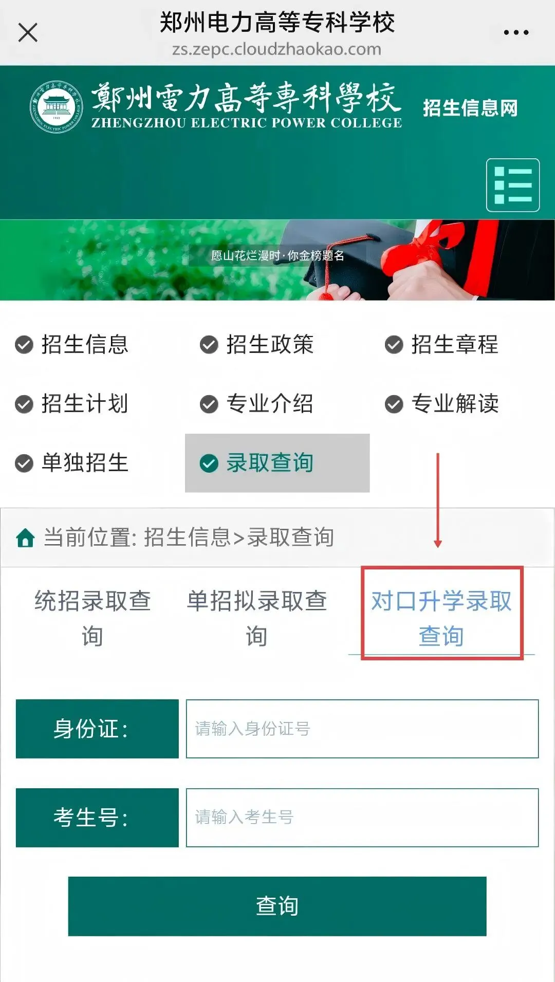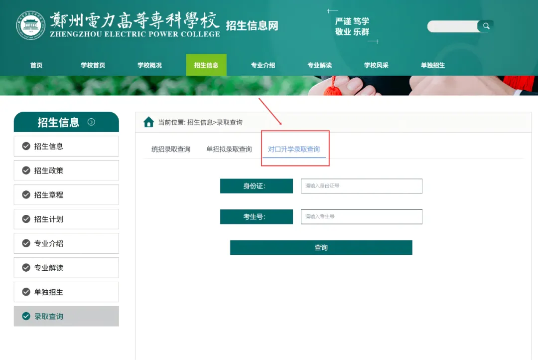 进入郑州电力高等专科学校招生信息网,点击首页“录取查询-对口升学录取查询”,输入身份证号及考生号查询录取结果。