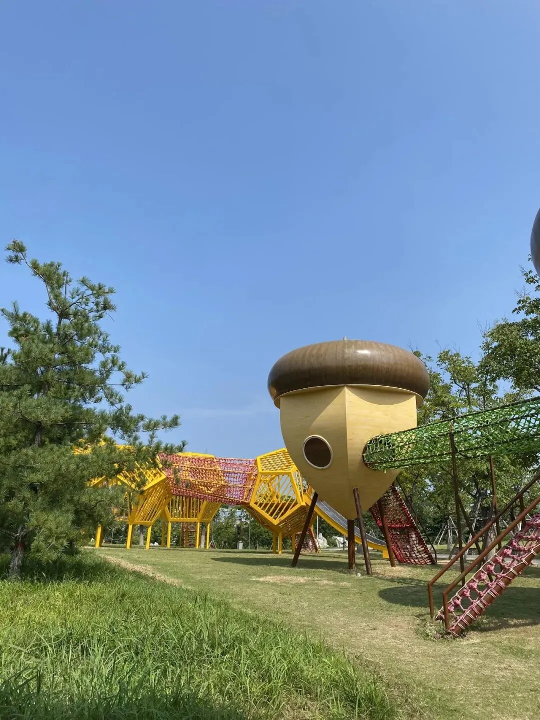 除此之外,公园还配备了超大无动力儿童乐园。沙坑、巨型攀爬架、网红滑梯、秋千一应俱全,让孩子们尽情释放电量,父母也能安心“躺平”。