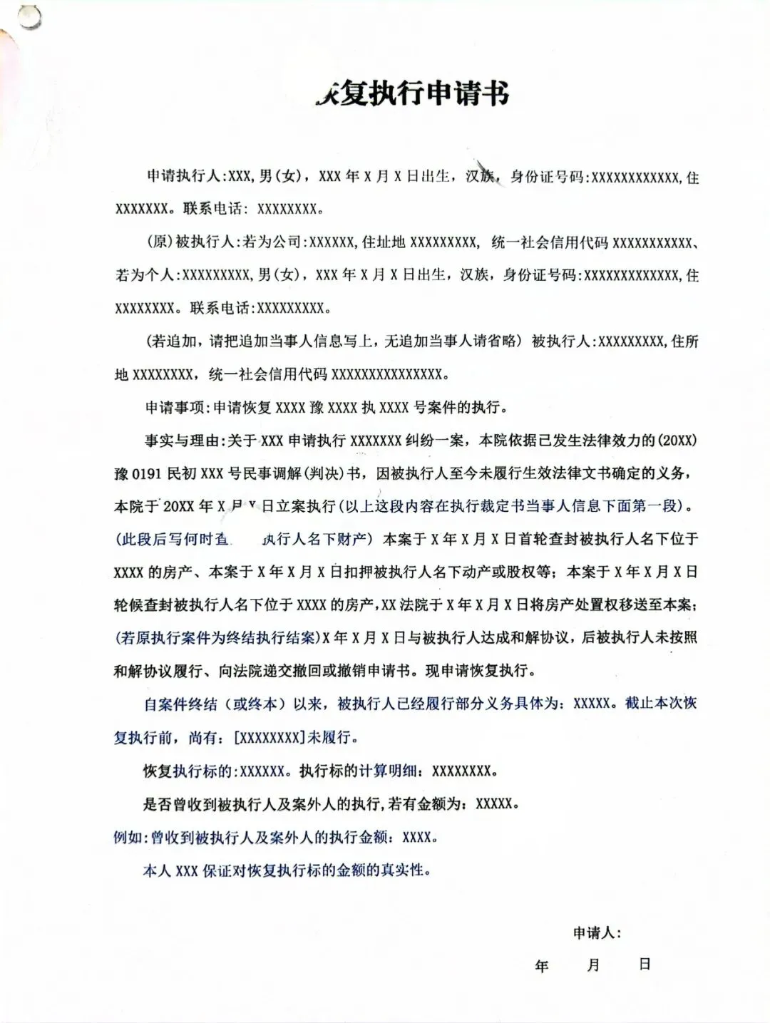 郑州高新技术产业开发区法院恢复执行要求以及恢复执行申请书