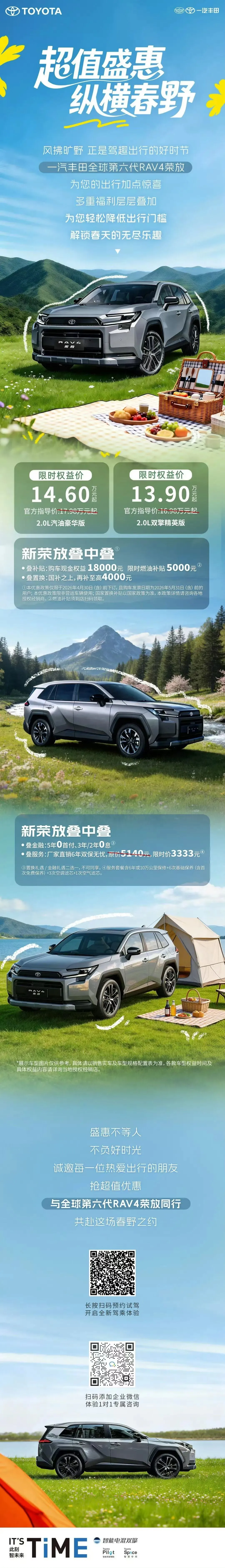 风拂旷野,草木萌新,正是驾趣出行的好时节!一汽丰田全球第六代RAV4荣放,带着春日专属福利向你奔赴而来,多重惊喜叠加,轻松降低你的出行门槛,陪你解锁春天的N种打开方式。