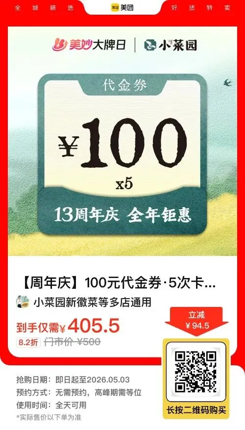 郑州的徽菜控注意啦!🔥小菜园新徽菜周年庆放大招,405.5元抢原价500元【100元代金券·5次卡】~