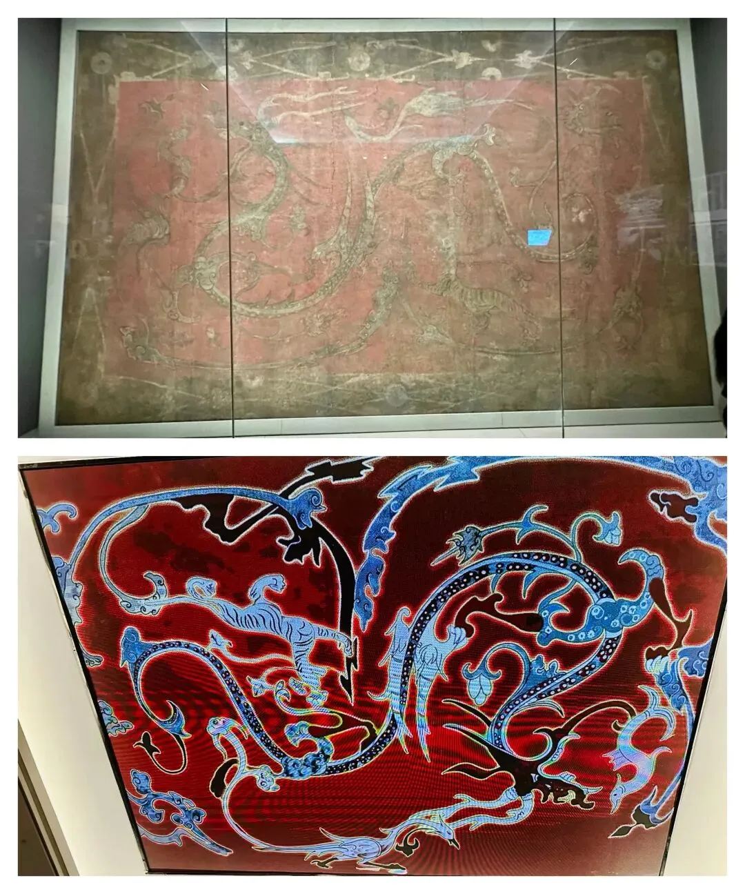 四神云气图壁画。这是西汉王陵巨幅壁画。图中是一条长达7.5米的巨龙,张开双翼,蜿蜒腾跃于云气之中;上方朱雀,长喙啄龙角,尾羽飘扬;右下方为白虎,前爪攀仙山,口衔灵芝。这是中国现存年代最早、保存最完整、等级最高的墓室壁画,被誉为“敦煌前的敦煌”,“敦煌外的敦煌”。