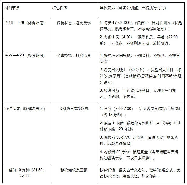 备考节奏重构:4 月要同时收尾体育、实验,冲刺模考,时间紧、任务重,需精准分配精力。