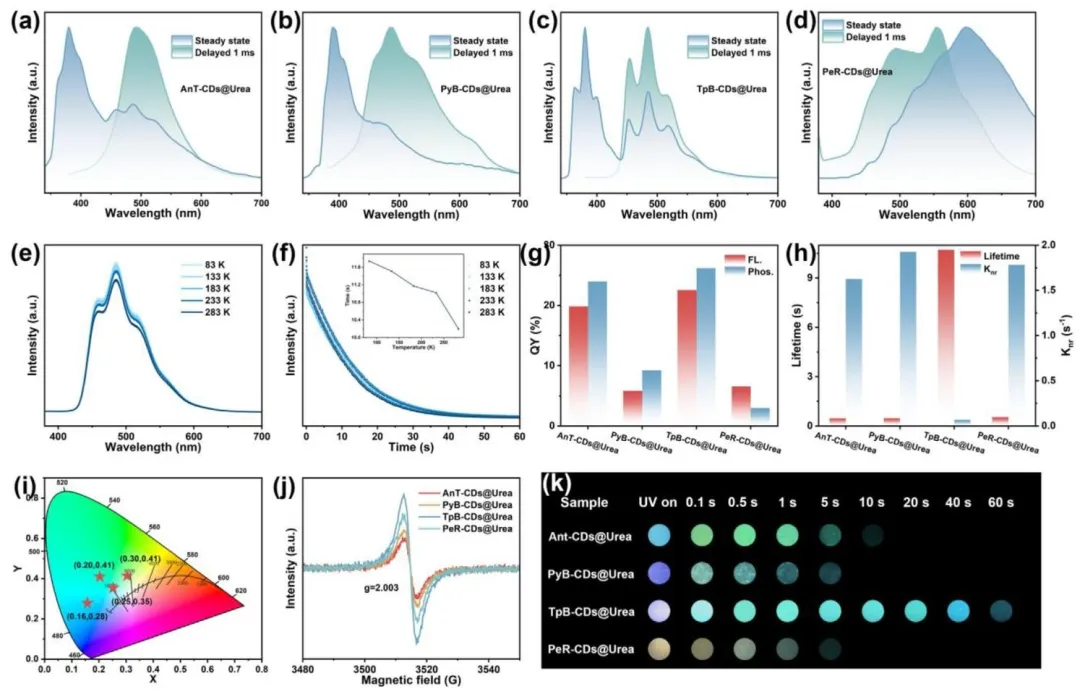 图 3、四种复合材料的光学性能。(a) AnT‑CDs@Urea、(b) PyB‑CDs@Urea、(c) TpB‑CDs@Urea、(d) PeR‑CDs@Urea 的归一化稳态与延迟光谱;(e) 不同温度下 TpB‑CDs@Urea 复合材料的余辉光谱;(f) 不同温度下 TpB‑CDs@Urea 复合材料的余辉衰减曲线(右上角插图为寿命随温度变化趋势);(g) 300 nm 激发下四种复合材料的荧光(FL.)与磷光(Phos.)量子产率;(h) 四种复合材料的余辉寿命与非辐射衰减速率;(i) 余辉发射的 CIE 坐标图;(j) 365 nm 激发后四种复合材料的 EPR 谱图;(k) 365 nm 紫外灯激发后拍摄的四种复合材料照片;