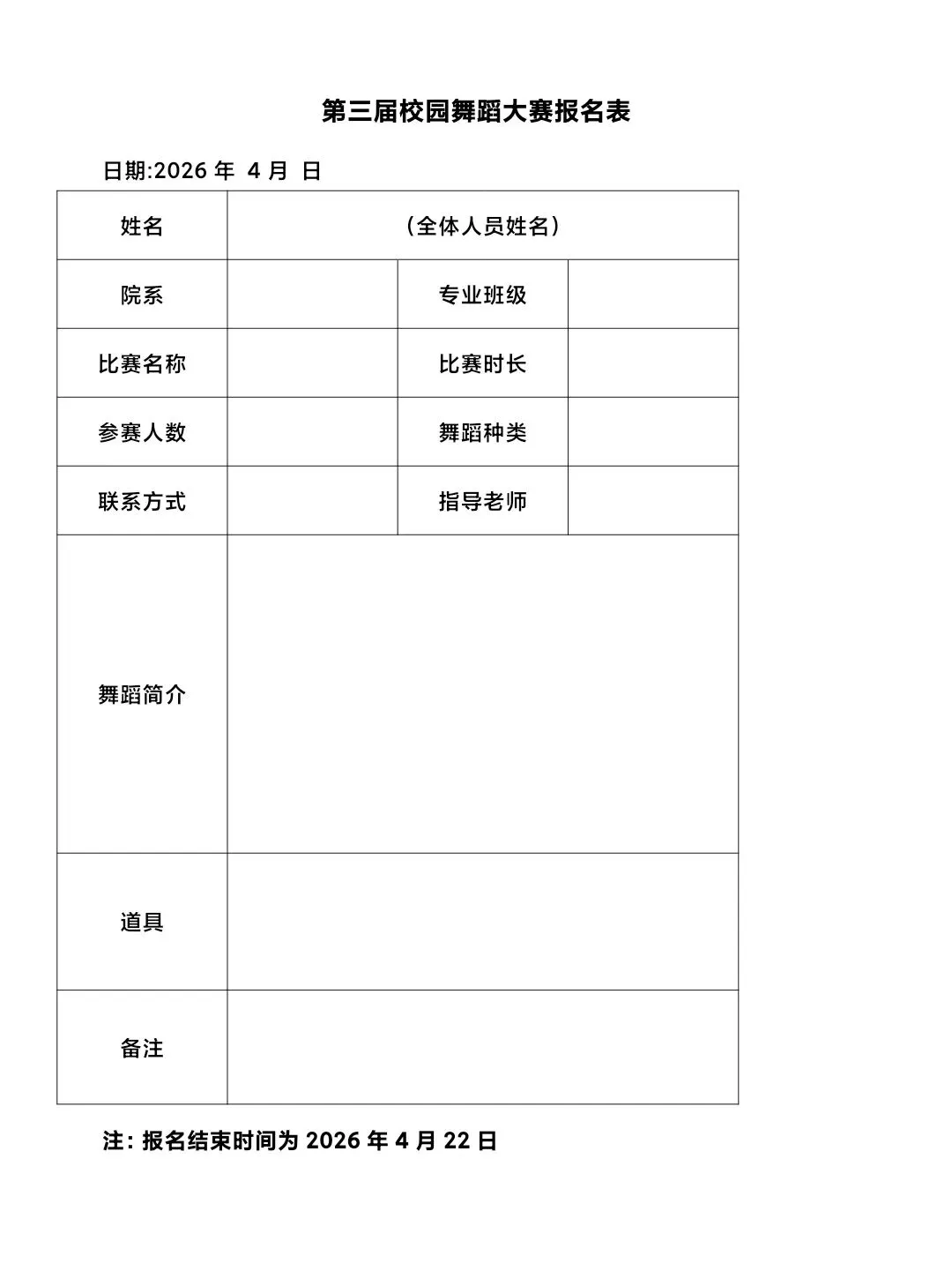 团体赛:多人舞蹈(3人及以上)鼓励各班级,社团发挥集体力量,踊跃报名。