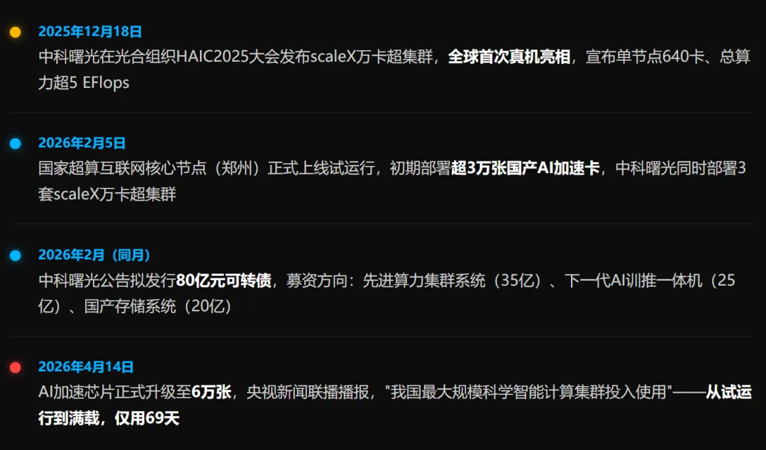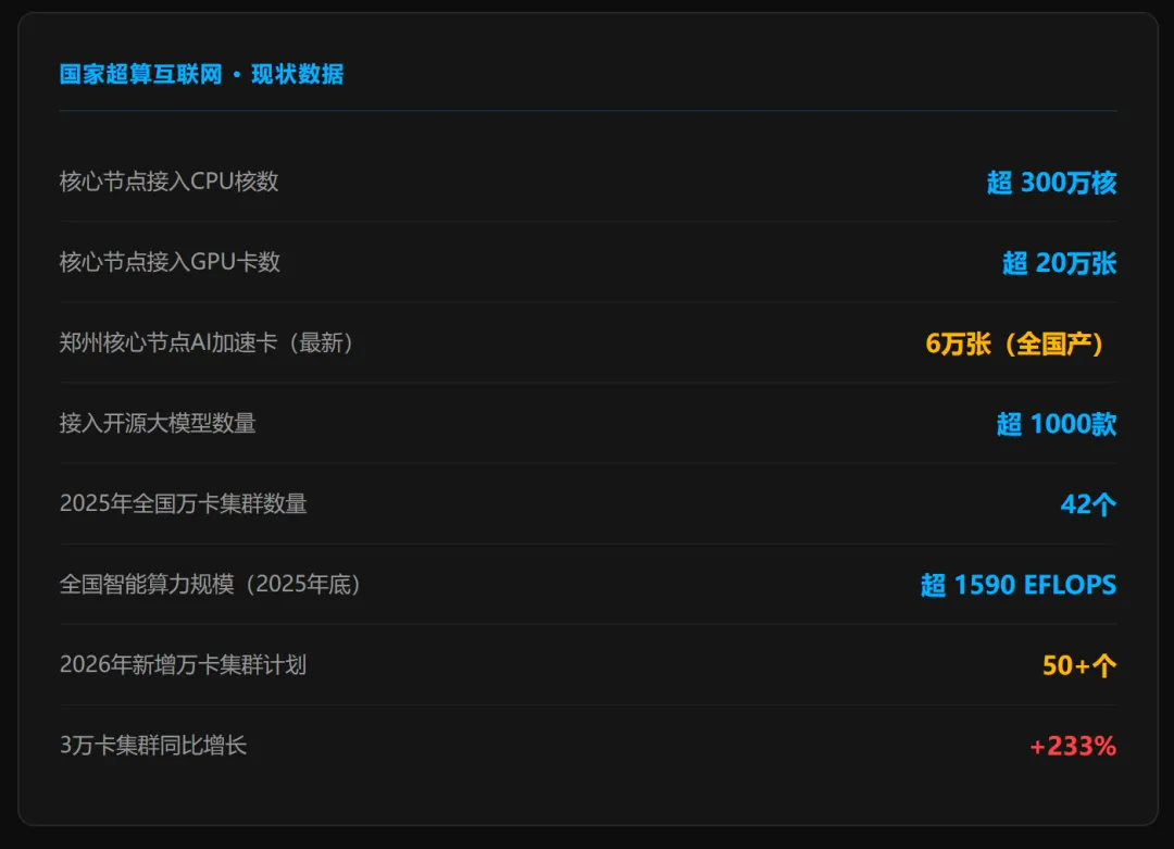 2026年4月14日,央视新闻联播播出了一条乍看不起眼的消息:郑州国家超算互联网核心节点AI加速芯片规模从3万张升级至6万张,正式投入使用,成为全国最大规模科学智能计算基础设施。和很多算力新闻不同,这条不是发布会上的PPT,不是招标公告里的愿景,而是已经在跑的系统——6万张国产AI加速卡,全栈自研,蛋白质折叠模拟加速1000倍,液态水分子动力学计算打破世界纪录。1、从3万到6万:69天发生了什么