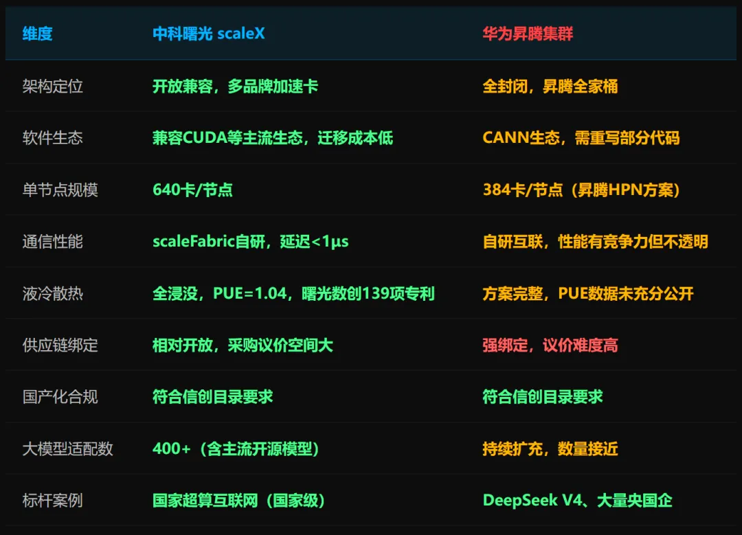 640卡/节点是什么概念?英伟达DGX GB200 NVL72的单节点规模是72张GPU。640 vs 72,差距近9倍。当然这不是公平的算力对比——架构不同,片间带宽也不同——但它说明中科曙光选择的路径是「高密度、大节点」,以减少跨节点通信开销。自研网络芯片scaleFabric是这套集群能做大的关键。当集群规模超过万卡,互联网络的性能往往比芯片本身更决定实际训练效率。260纳秒的交换芯片转发延迟、比InfiniBand快2.33倍的节点间通信,意味着在跑大规模并行任务时,等待数据传输的空档时间大幅压缩。PUE=1.04的全浸没液冷——全国数据中心平均PUE是1.5左右,绿色数据中心目标是1.3以下,1.04意味着每消耗100份算力用电,只有4份额外花在散热上。这一数据的背后是曙光数创139项液冷专利的技术积累。与华为的路线差异:华为昇腾集群是全封闭自研生态——芯片、互联、软件必须全用华为。scaleX的定位是「开放兼容」,支持多品牌国产加速卡混合部署,兼容主流计算生态,已适配400+主流大模型。这对采购方意味着什么?不被绑定单一厂商,议价空间更大,迁移成本更低。3、6万卡跑什么?三项科研成果震了谁