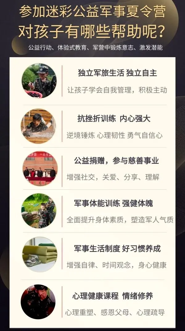 4、公益行动,传递公益爱心与社会责任感,让更多家庭能以最优价格,参加军事夏令营历练。