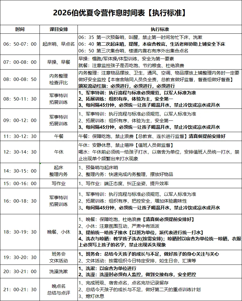 师资配比:10:1--10 人为一个班,每班配备一名主训教官、一名辅助教官,辅助教官 24 小时陪护。