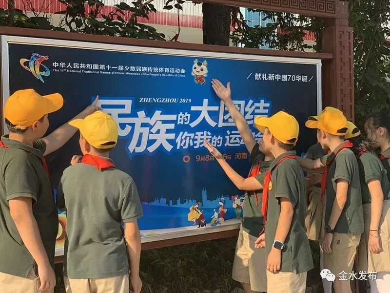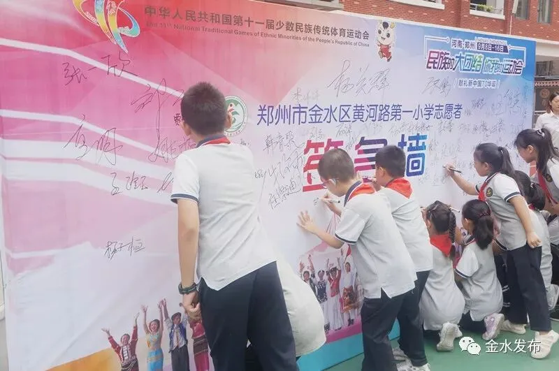 金水区文化路第一小学以“河南‘郑’能量 世界共分享”为主题,号召文一学子从身边的小事做起,用实际行动助力民族运动会,展示郑州、金水的良好形象。金水区纬三路小学挖掘本校品牌课程“黄河课程”资源,组织参加暑期黄河游学的学生分享活动收获,在传播中原文化的过程中激发学生热爱家乡的情感,组织合唱社团的孩子们通过合唱《爱我中华》表达了对祖国的热爱之情。金水区黄河路第一小学举行了“喜迎民族运动会 争做文明有礼郑州人”签名仪式,倡议师生争做热情好客、文明有礼、遵章守纪、环保低碳、友爱奉献、民族团结的东道主。金水区黄河路第三小学提出“文明是城市之魂,美德是修身之本”,利用班队会举行民族运动会知识竞赛,并围绕“如何做一个守‘序’、懂‘礼’、有责任的人,争做出彩好少年”,组织学生进行讨论。金水区南阳路第一小学围绕“民族一家亲”“红领巾我的骄傲”“民族的大团结 你我的运动会”等主题,利用少先队活动课进行民族运动会知识宣传和文明礼仪养成教育,并通过“小手拉大手”倡议少先队员带头践行文明新风,争做文明传播小天使,把文明带回家、带到社会。金水区艺术小学在少先队活动课上进行民族运动会知识普及,引导学生观察郑州市的变化,通过朗朗上口的儿歌鼓励学生做文明的小学生。金水区工人第一新村小学组织各班开展了“红领巾庆新中国七十华诞”主题队会,学习赛事文化,传播中华优秀传统文化。郑州龙门实验学校组织各班利用少先队活动课、共青团活动课开展“办好民族运动盛会 建好国家中心城市”主题文明教育实践活动,引导师生文明出行、文明言行,争当民族运动会宣传员,并开展手抄报评比活动。