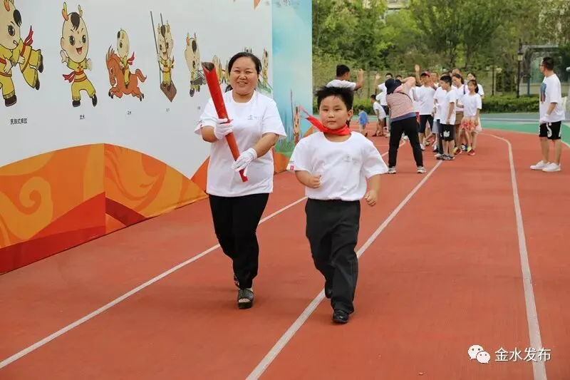金水区第二实验小学孩子和家长参加模拟火炬传递活动