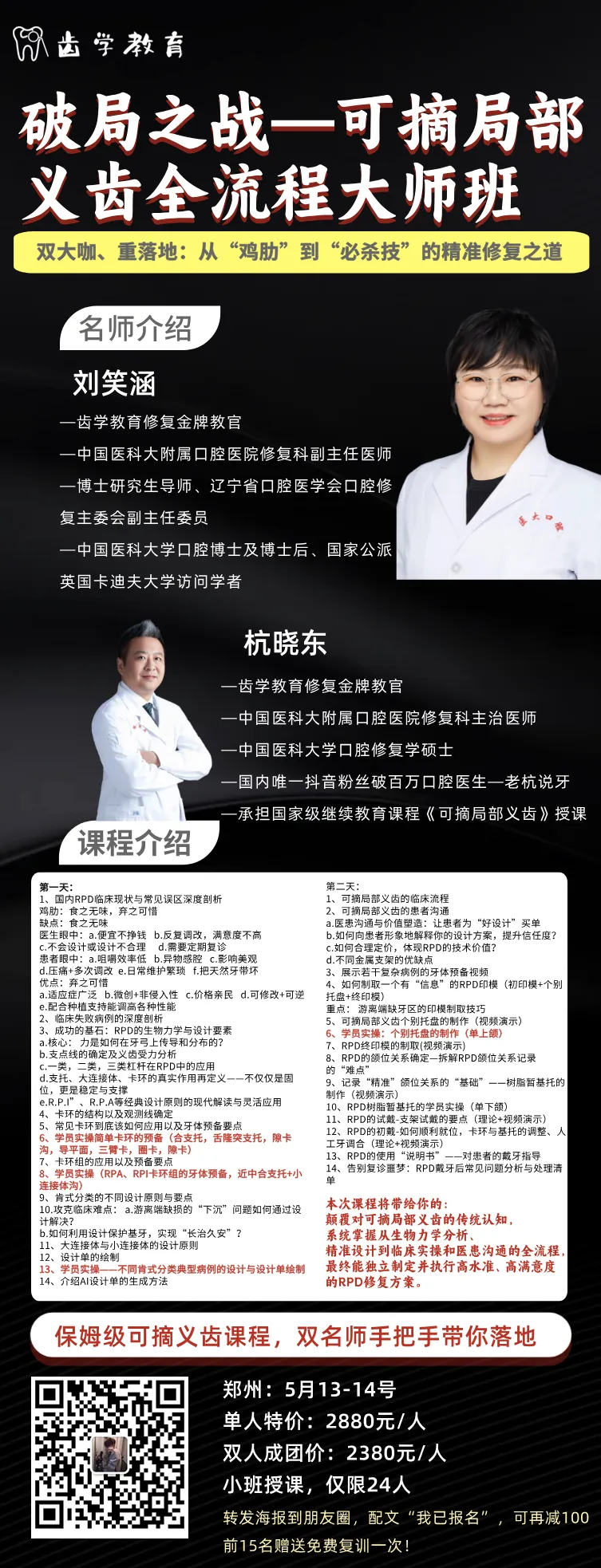 #5月13-14日郑州站 中国医科大修复科副主任医师、博士研究生导师、中国医科大博士后、资深专家刘笑涵教授联合中国医科大修复学硕士、中国医科大修复科主治医师、知名讲师杭晓东老师主讲,两天时间,理论+实操,真正让你落地,破局!